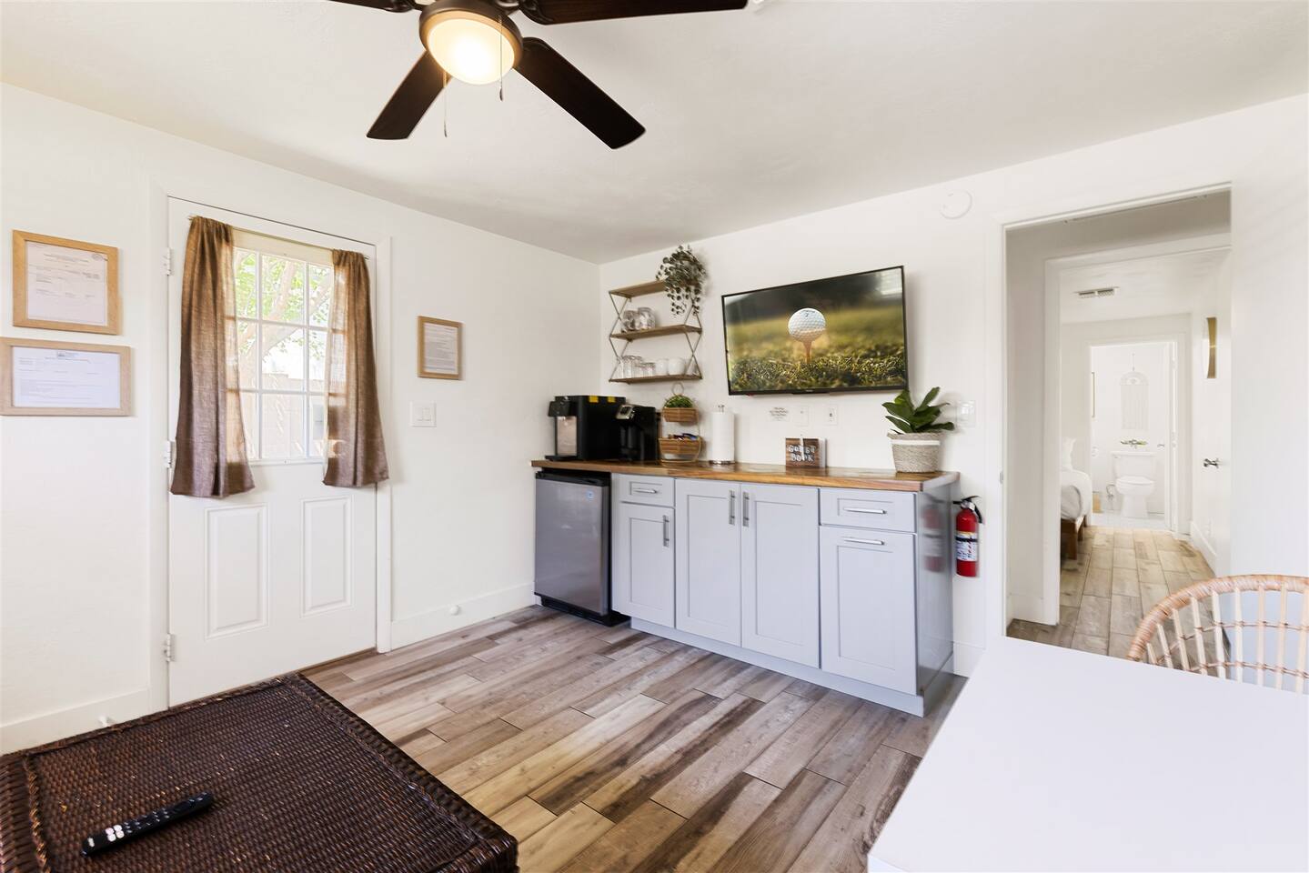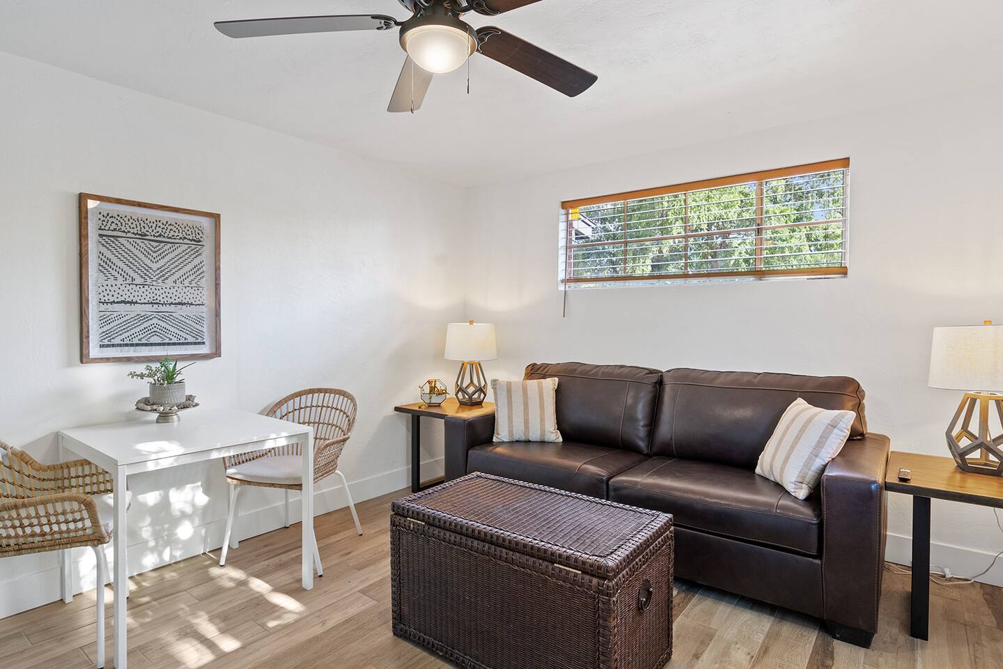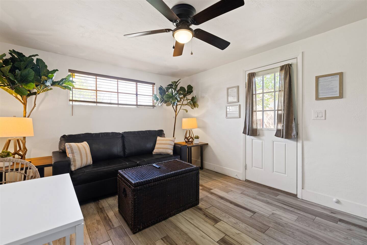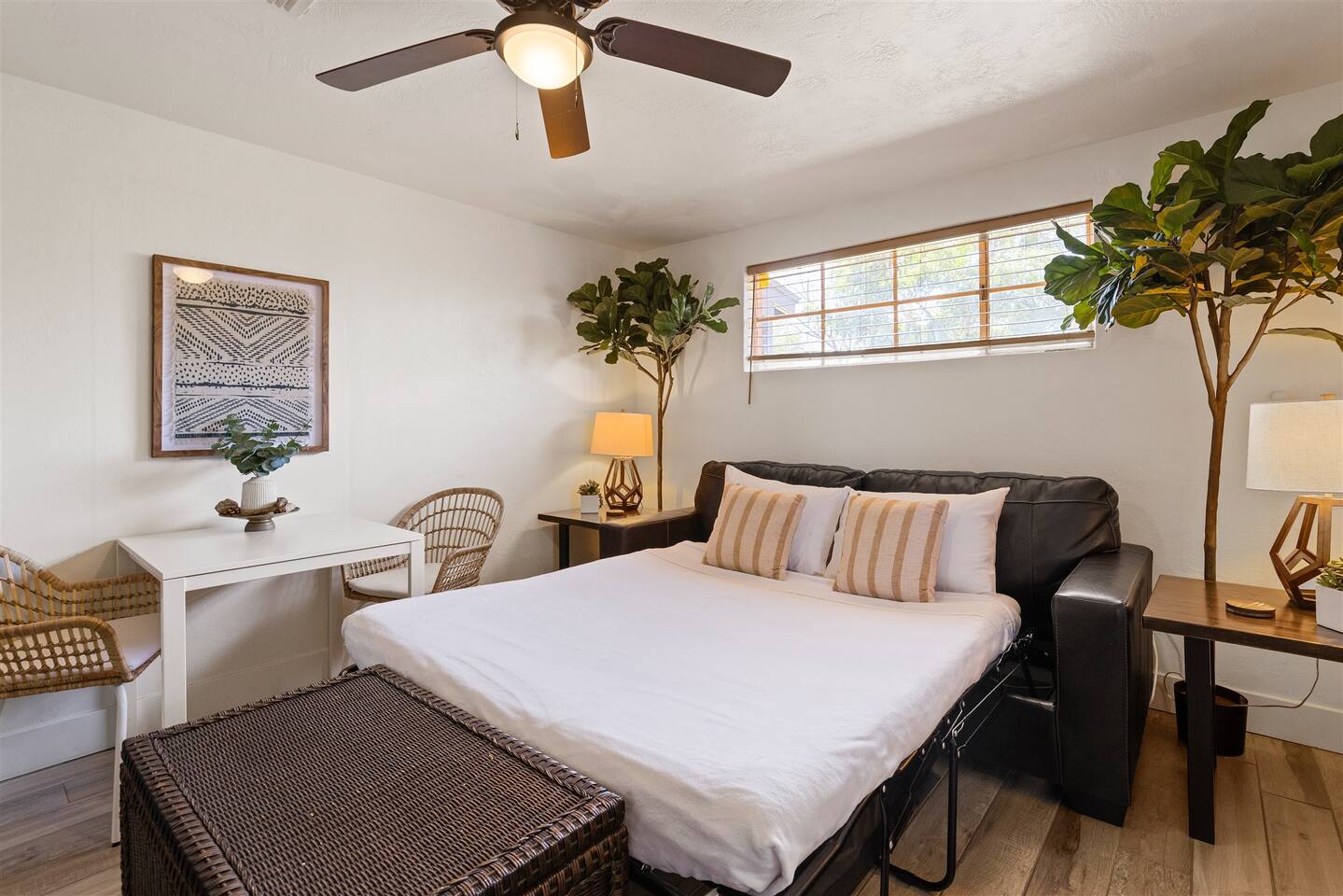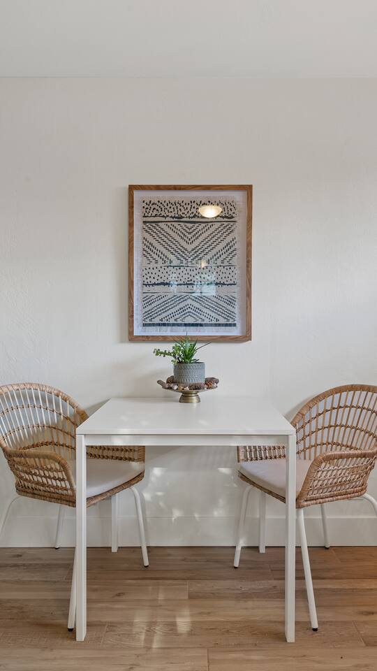 HEALTH AND CLEANLINESS Our unit is known for maintaining high cleanliness ratings. Our cleaning staff uses Lysol sterilizing products throughout the unit. All linens are washed with HOT water and sanitizing products. GENERAL SPACE INFO This newly remodeled guest suite is set up like a duplex and is excellent for those traveling alone, couples, or business travelers. Enter through your private entrance to view a newly remodeled bedroom, bathroom, living area, dining area, and kitchenette. We've styled this modern boho suite to provide a downtown apartment feel into this home. THE BEDROOM SPACE This newly remodeled bedroom features a king-size bed with fresh white linens and four king-sized pillows. The bedroom also features a large arched-top floor mirror and a boho-style nightstand with a touch-controlled table lamp with USB plugs for charging your phones. The bedroom also has a large semi-walk-in closet with hangers, an iron and ironing board, and extra blankets. THE BATHROOM This newly remodeled bathroom includes a sink, toilet, shower/tub, hairdryer, hair straighter, towel rack/hooks, and fresh towels. As added amenities, you will be provided complimentary hand soap, shampoo, conditioner, body soap, and extra towels for your stay. THE KITCHENETTE/COFFEE BAR The kitchenette includes a large under-counter fridge, 3-in-1 microwave, air fryer, convection oven, Keurig coffeemaker, countertop water dispenser, toaster, plates, glasses, utensils, and towels. The kitchenette is supplied with coffee pods, sugar, and coffee creamer. Like most kitchenettes, this unit does NOT have a kitchen sink. THE LIVING ROOM AREA The living room area features a 3 person pull-out couch with end tables and a 55" Smart TV with all the streaming services you'll need. The pull-out couch is a 5-inch memory foam bed, supplied with fresh white sheets, a Serasoft Blanket, and 2 down feather pillows. OUTSIDE/PROPERTY INFO The outdoor area for this unit has a new, fully fenced-in area with tropical plants, a grapefruit tree hammock, and a seating area.