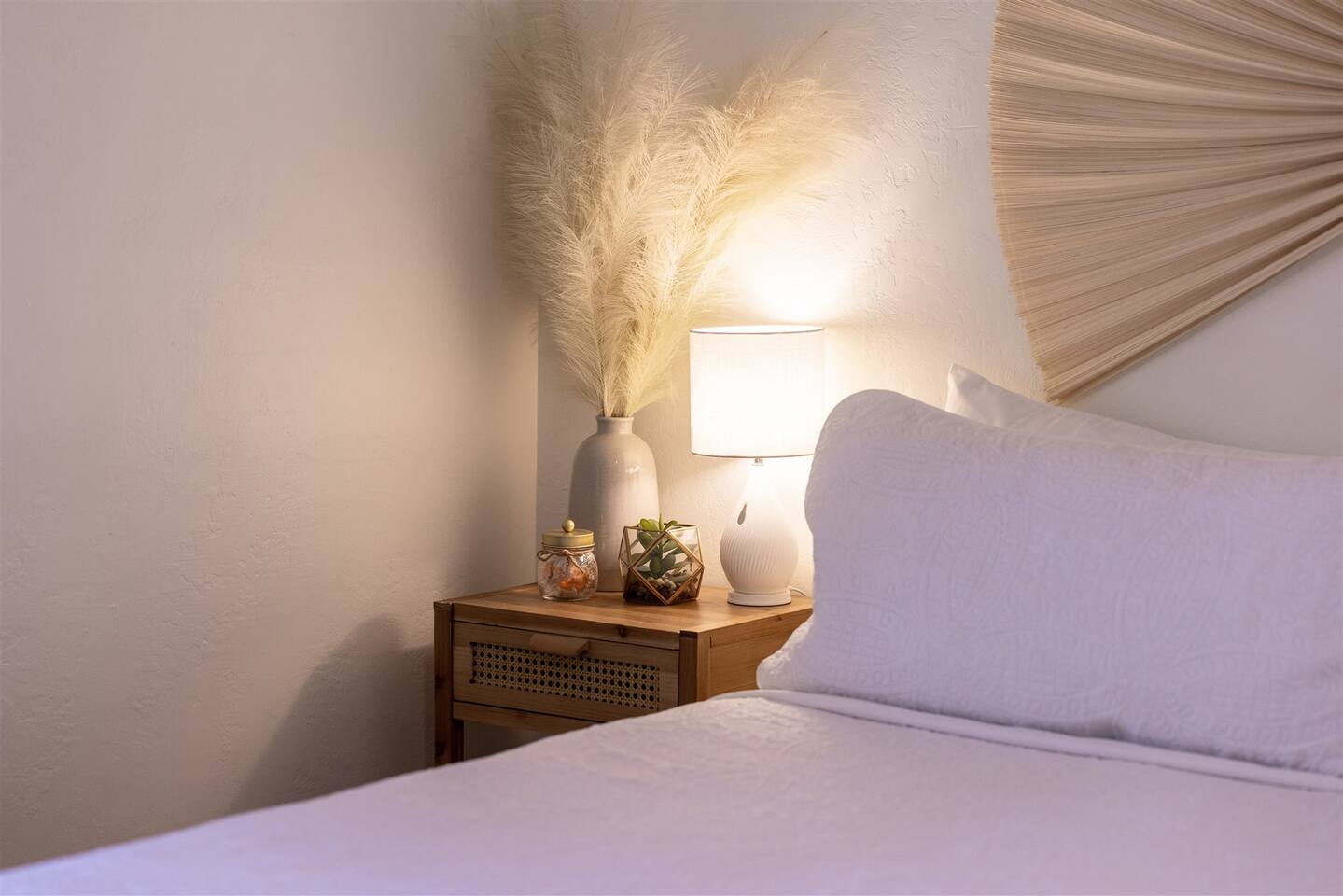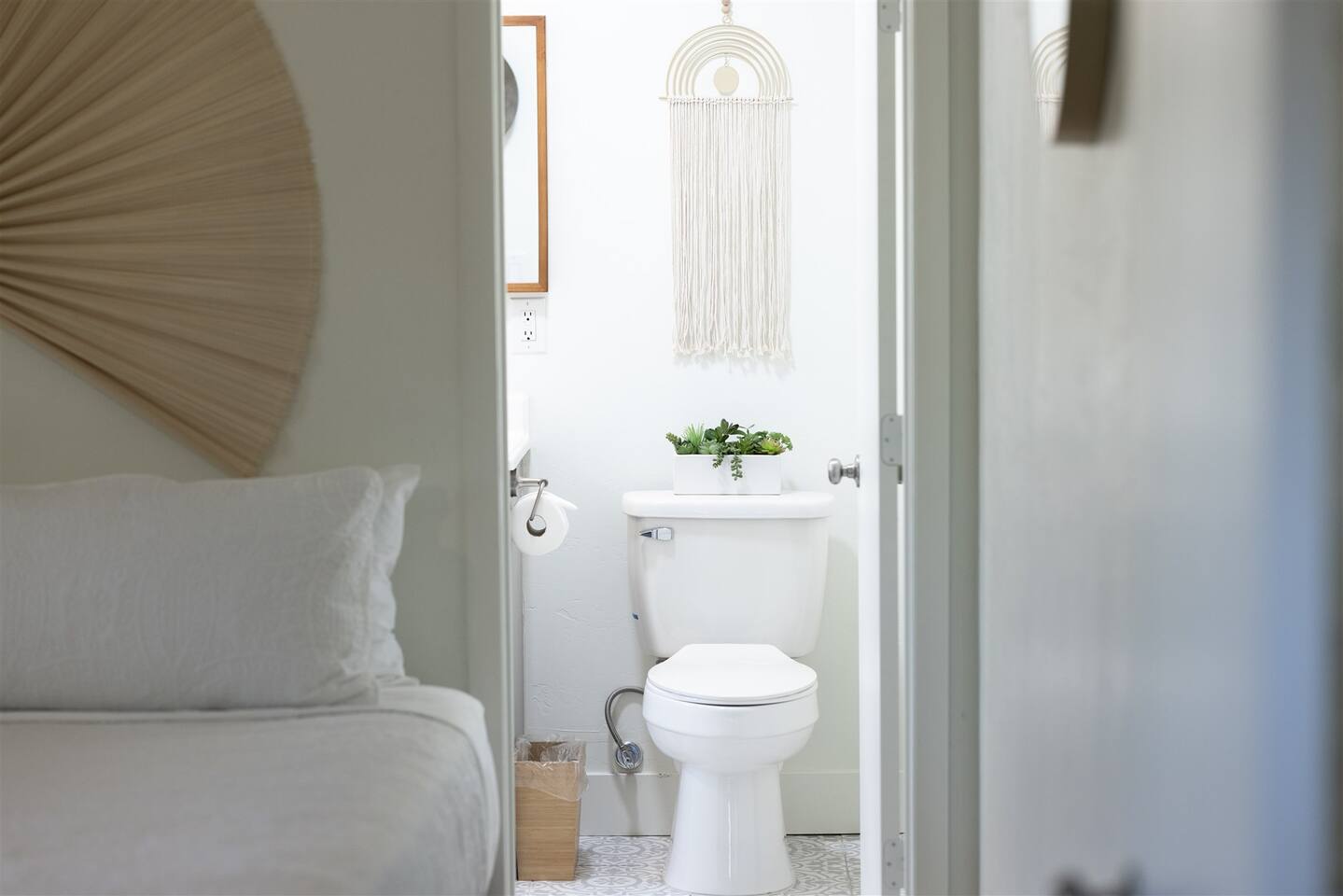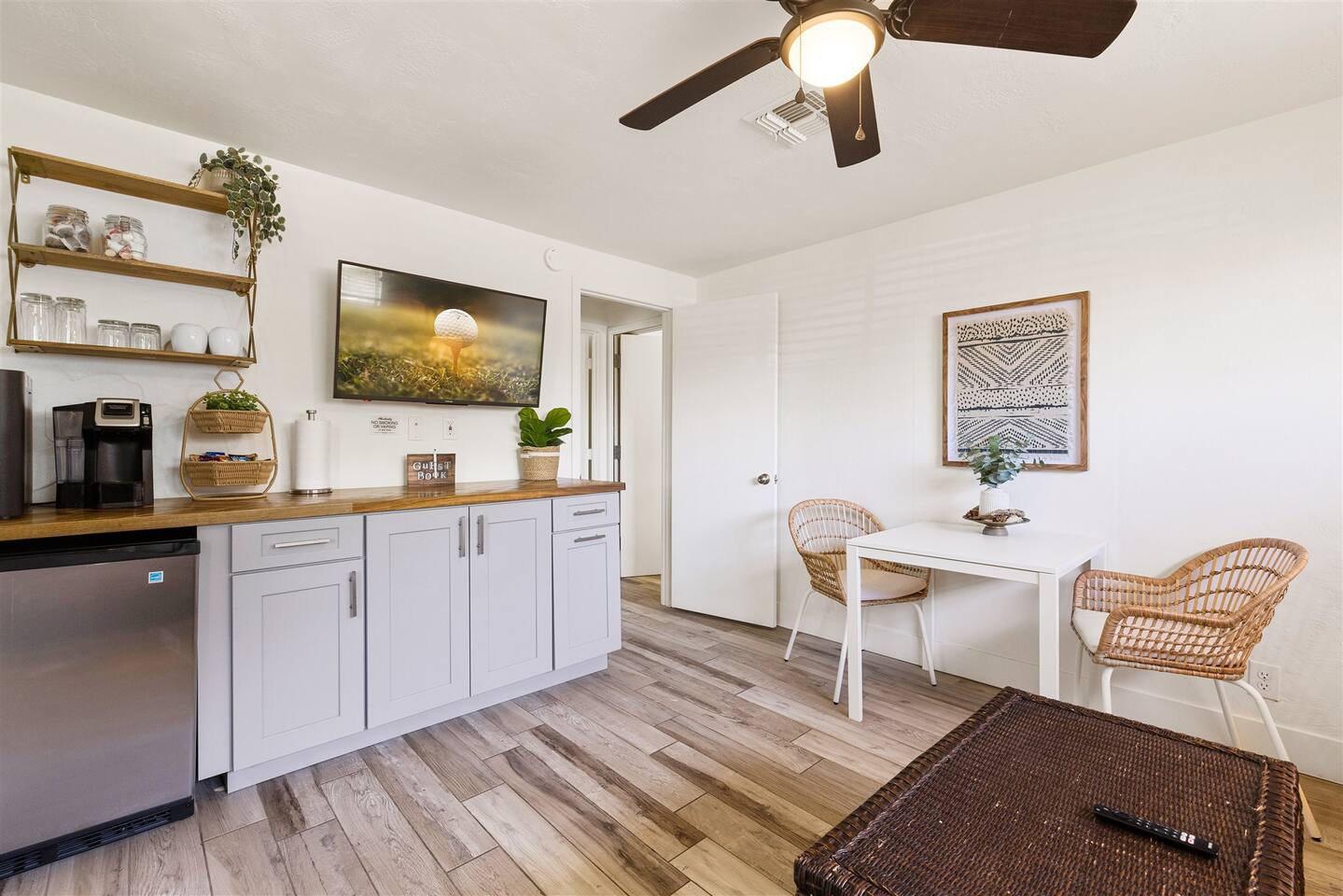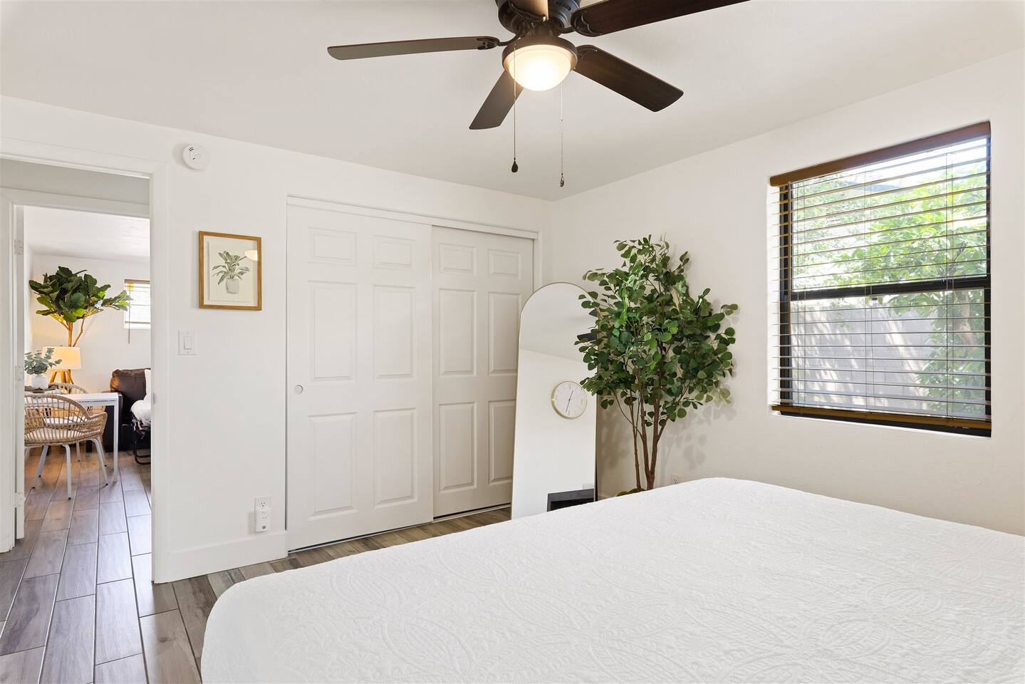 HEALTH AND CLEANLINESS Our unit is known for maintaining high cleanliness ratings. Our cleaning staff uses Lysol sterilizing products throughout the unit. All linens are washed with HOT water and sanitizing products. GENERAL SPACE INFO This newly remodeled guest suite is set up like a duplex and is excellent for those traveling alone, couples, or business travelers. Enter through your private entrance to view a newly remodeled bedroom, bathroom, living area, dining area, and kitchenette. We've styled this modern boho suite to provide a downtown apartment feel into this home. THE BEDROOM SPACE This newly remodeled bedroom features a king-size bed with fresh white linens and four king-sized pillows. The bedroom also features a large arched-top floor mirror and a boho-style nightstand with a touch-controlled table lamp with USB plugs for charging your phones. The bedroom also has a large semi-walk-in closet with hangers, an iron and ironing board, and extra blankets. THE BATHROOM This newly remodeled bathroom includes a sink, toilet, shower/tub, hairdryer, hair straighter, towel rack/hooks, and fresh towels. As added amenities, you will be provided complimentary hand soap, shampoo, conditioner, body soap, and extra towels for your stay. THE KITCHENETTE/COFFEE BAR The kitchenette includes a large under-counter fridge, 3-in-1 microwave, air fryer, convection oven, Keurig coffeemaker, countertop water dispenser, toaster, plates, glasses, utensils, and towels. The kitchenette is supplied with coffee pods, sugar, and coffee creamer. Like most kitchenettes, this unit does NOT have a kitchen sink. THE LIVING ROOM AREA The living room area features a 3 person pull-out couch with end tables and a 55" Smart TV with all the streaming services you'll need. The pull-out couch is a 5-inch memory foam bed, supplied with fresh white sheets, a Serasoft Blanket, and 2 down feather pillows. OUTSIDE/PROPERTY INFO The outdoor area for this unit has a new, fully fenced-in area with tropical plants, a grapefruit tree hammock, and a seating area.