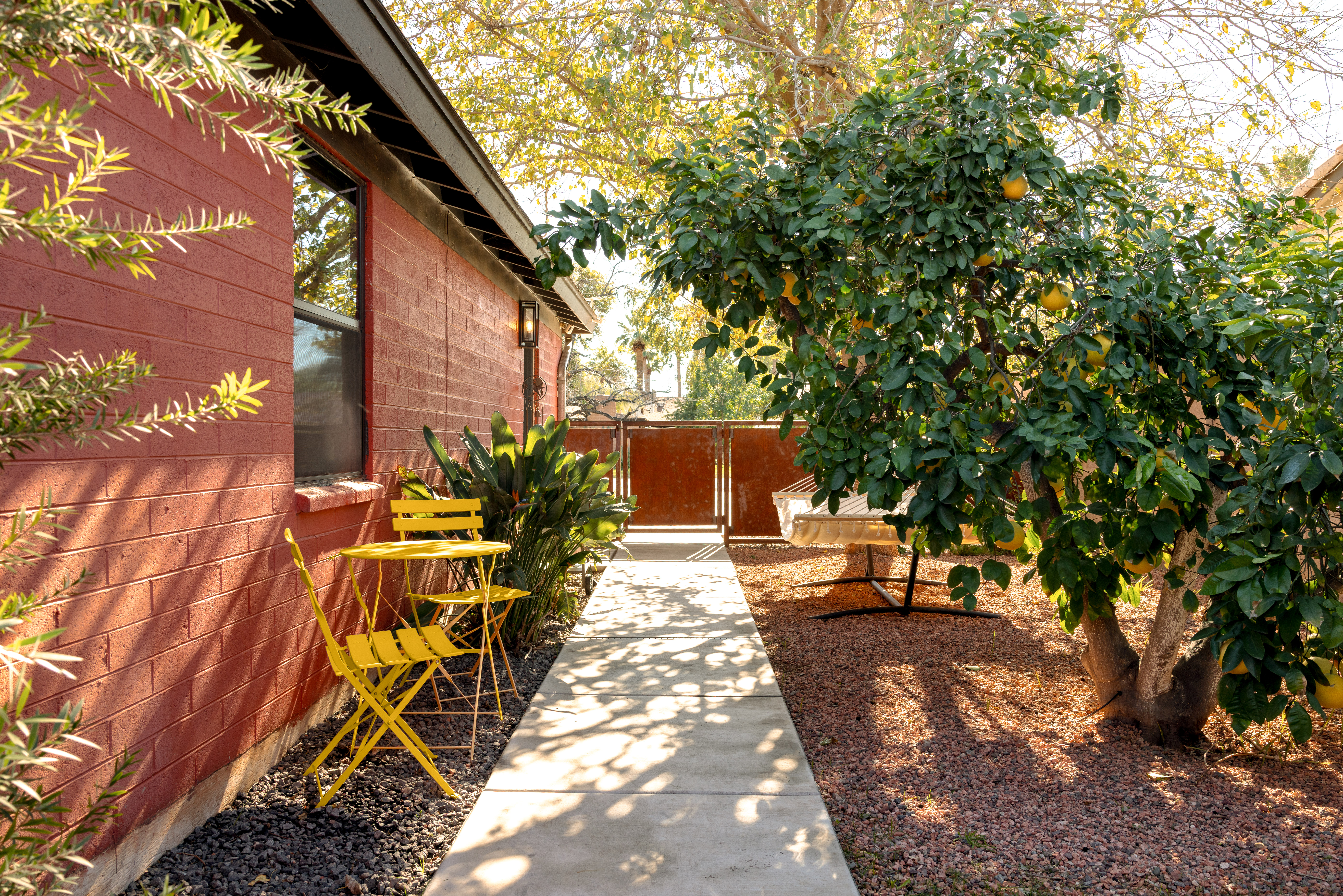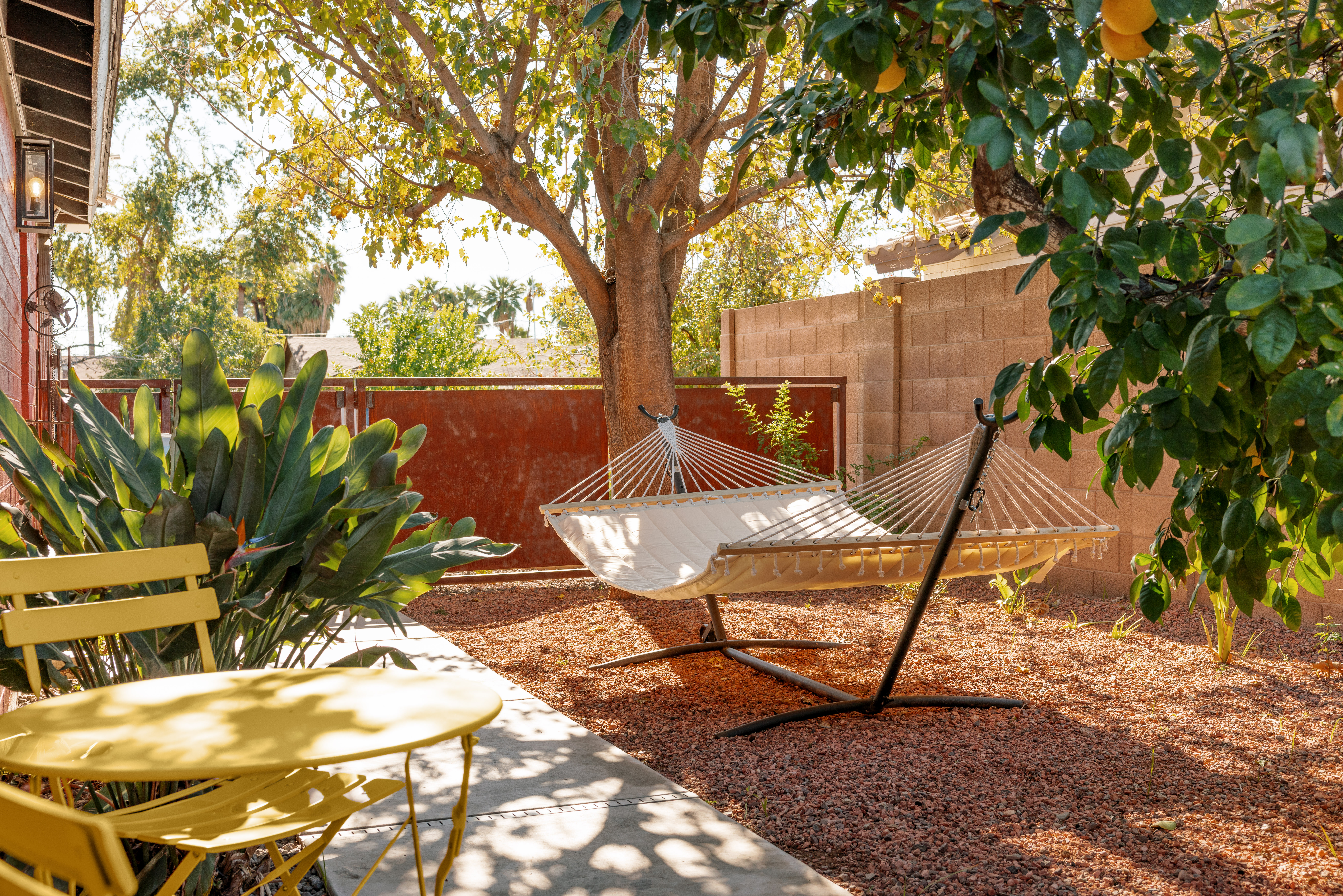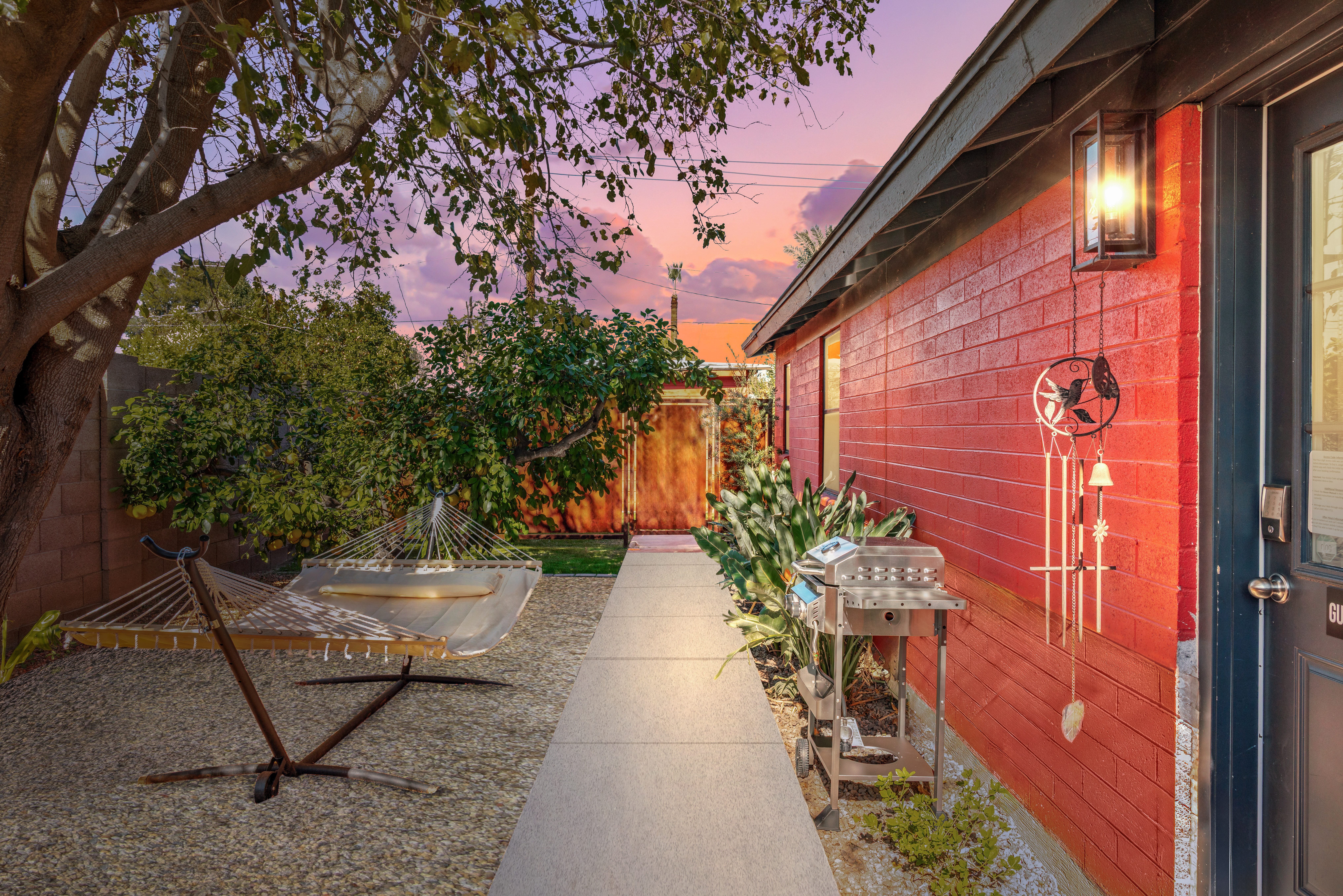 Escape to a modern boho guest suite just 5 minutes from Phoenix Airport. This newly remodeled private retreat is perfect for couples, vacationers, and business travelers looking for comfort, convenience, and style. Enjoy a plush king bed, dedicated workspace, high-speed Wi-Fi, and your own private fenced-in yard with a hammock and tropical plants. Centrally located between Scottsdale, Downtown Phoenix, and Tempe, this suite is the ideal base for your Arizona stay