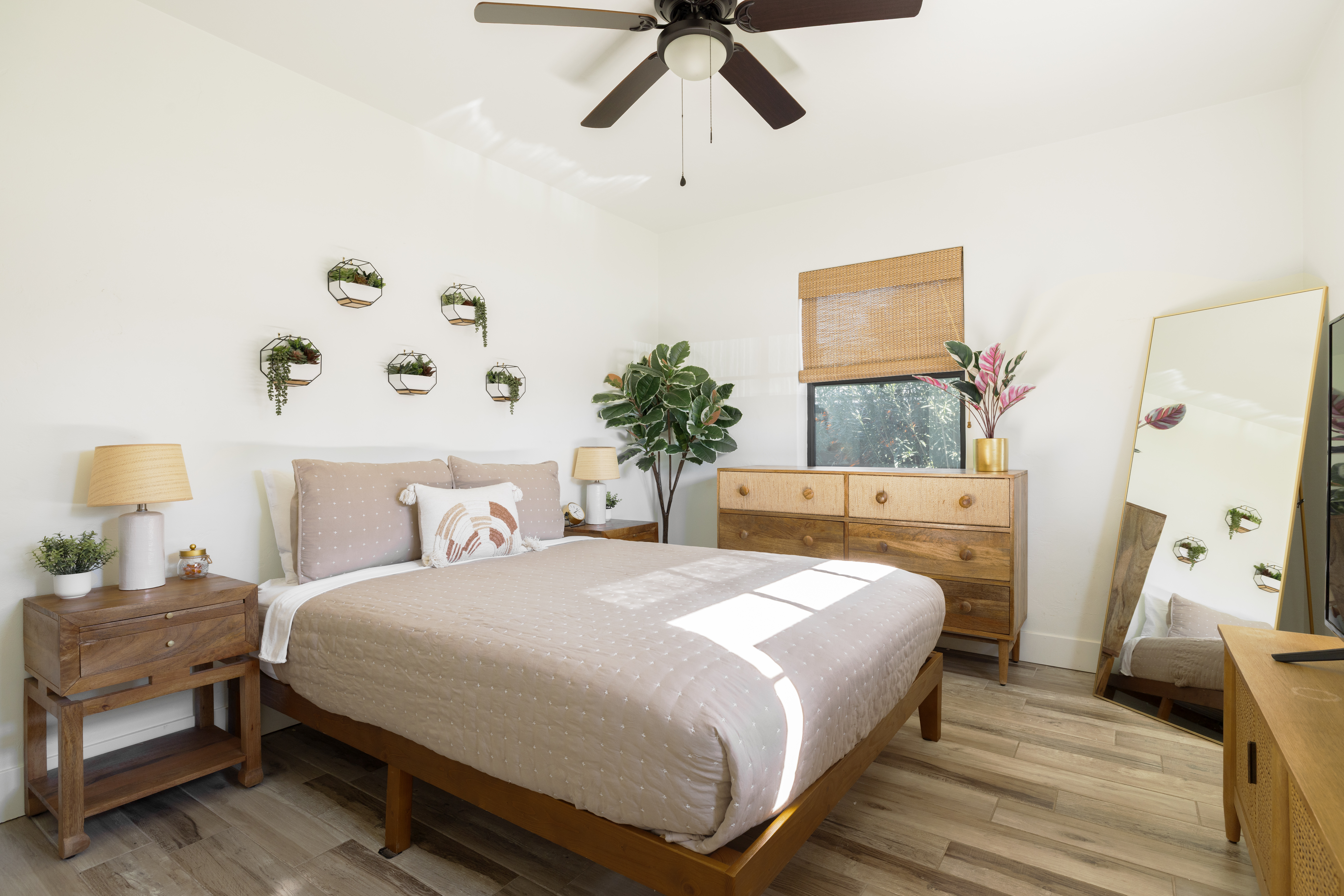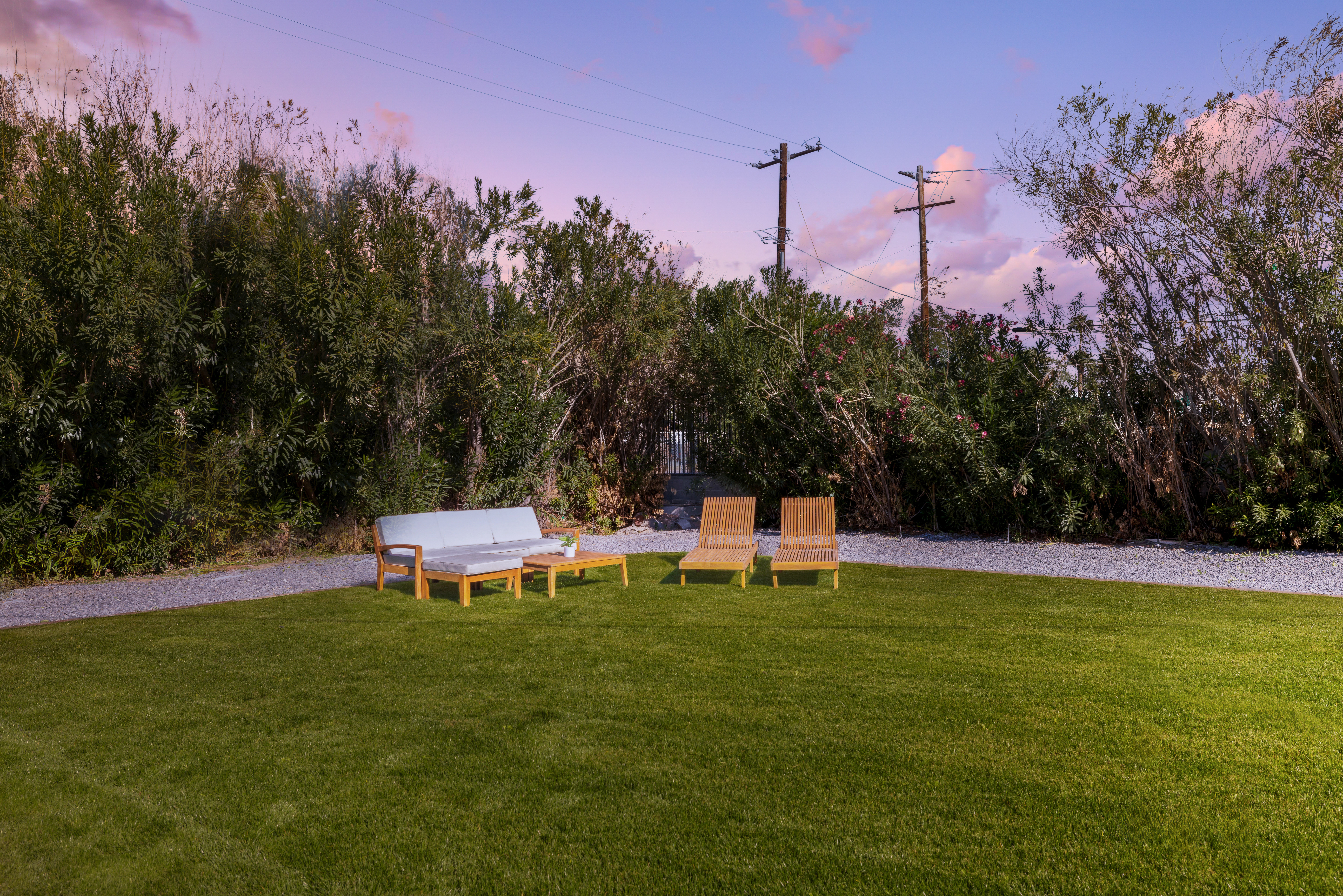 Designed with comfort and style in mind, this fully remodeled home features all-new furniture and a cohesive mid-century aesthetic. The property is professionally cleaned and sanitized before every stay, with all linens washed in hot, sanitized water. Living Area. Relax in the spacious living room featuring a new West Elm leather sectional, a 55" Smart HD TV with streaming services, fast Wi-Fi at 213 Mbps, and a dedicated workspace ideal for remote work or trip planning. Kitchen & Dining. Prepare meals in the fully equipped chef’s kitchen, complete with a large refrigerator featuring a reverse osmosis water dispenser, gas stove, microwave, dishwasher, blender, toaster, rice maker, Keurig, and all necessary cookware and utensils. A dedicated coffee bar and cocktail station with essential tools are provided for your enjoyment. Bedrooms. All three bedrooms feature comfortable queen-size beds dressed in fresh white linens and four down feather pillows. Each room includes a nightstand with built-in charging outlets, a large mirror, and a spacious closet with hangers and storage. Bathroom. The updated bathroom includes a tub/shower combination, fresh towels, and complimentary hand soap, shampoo, conditioner, and body wash. Laundry. An in-unit washer and dryer are available for guest use, making this home especially convenient for longer stays. Parking. Guests have access to driveway parking as well as free street parking directly in front of the home. Outdoor Space. Your private, fully fenced backyard features mature pomegranate, peach, and kumquat trees, along with comfortable seating—perfect for relaxing, working outdoors, or enjoying the Arizona sun.