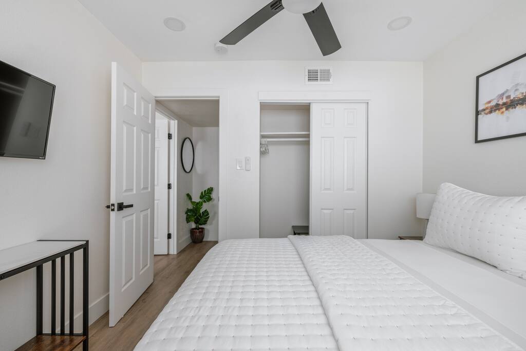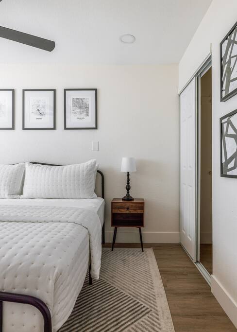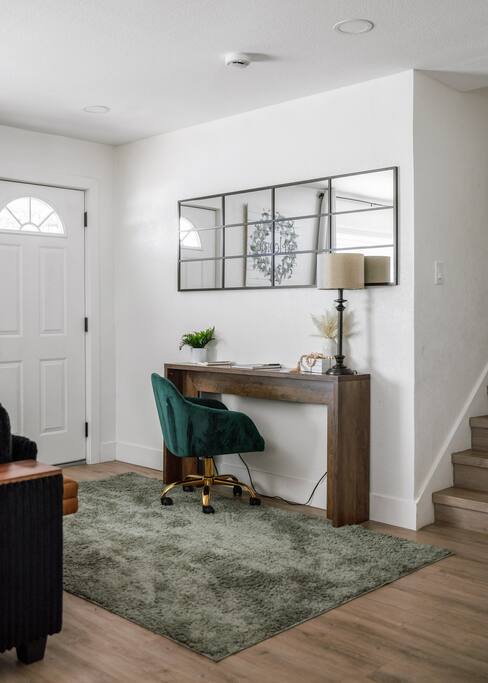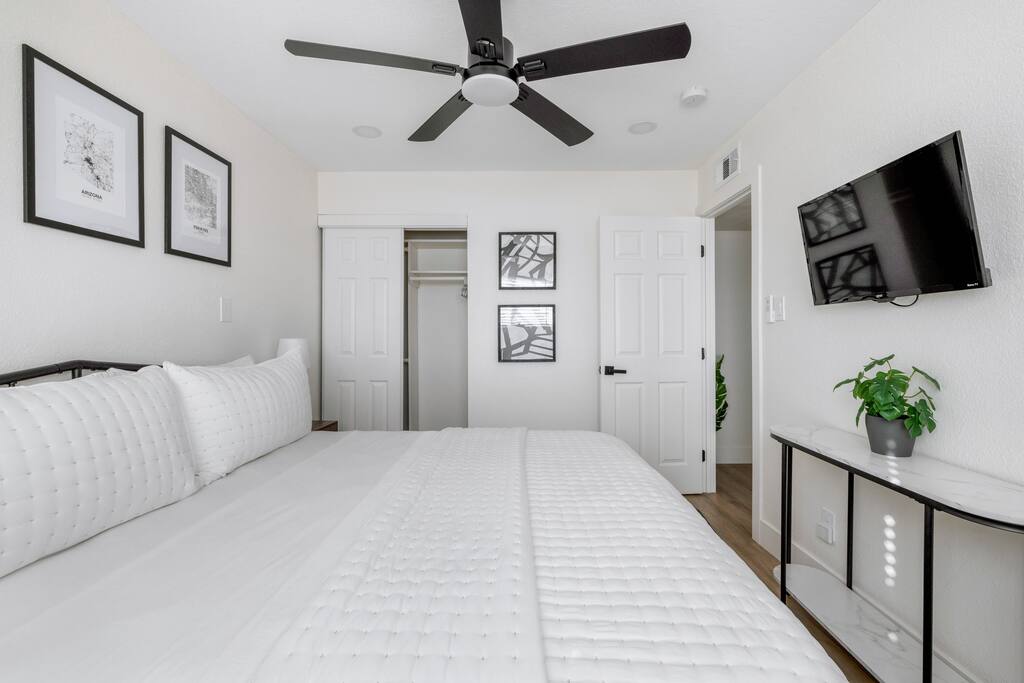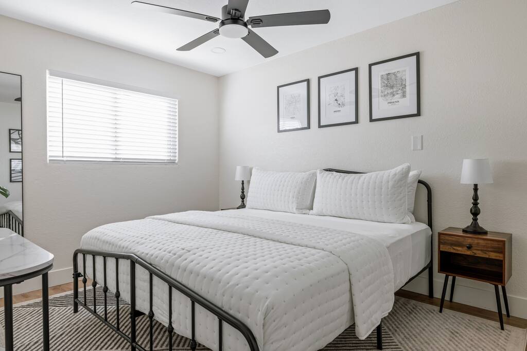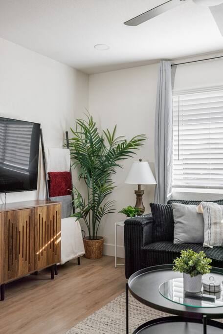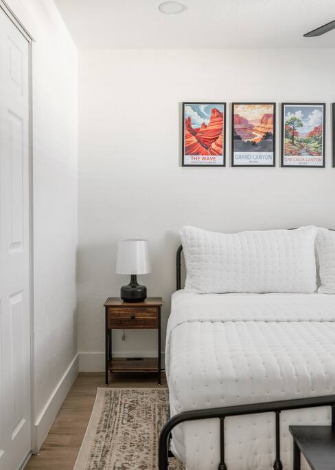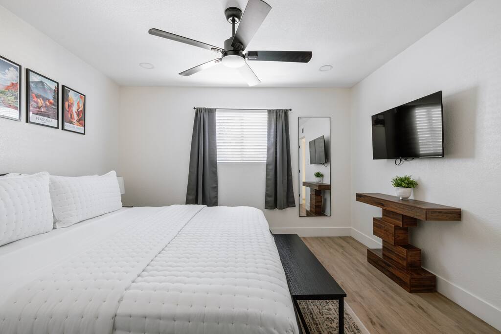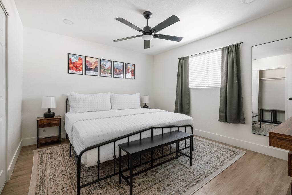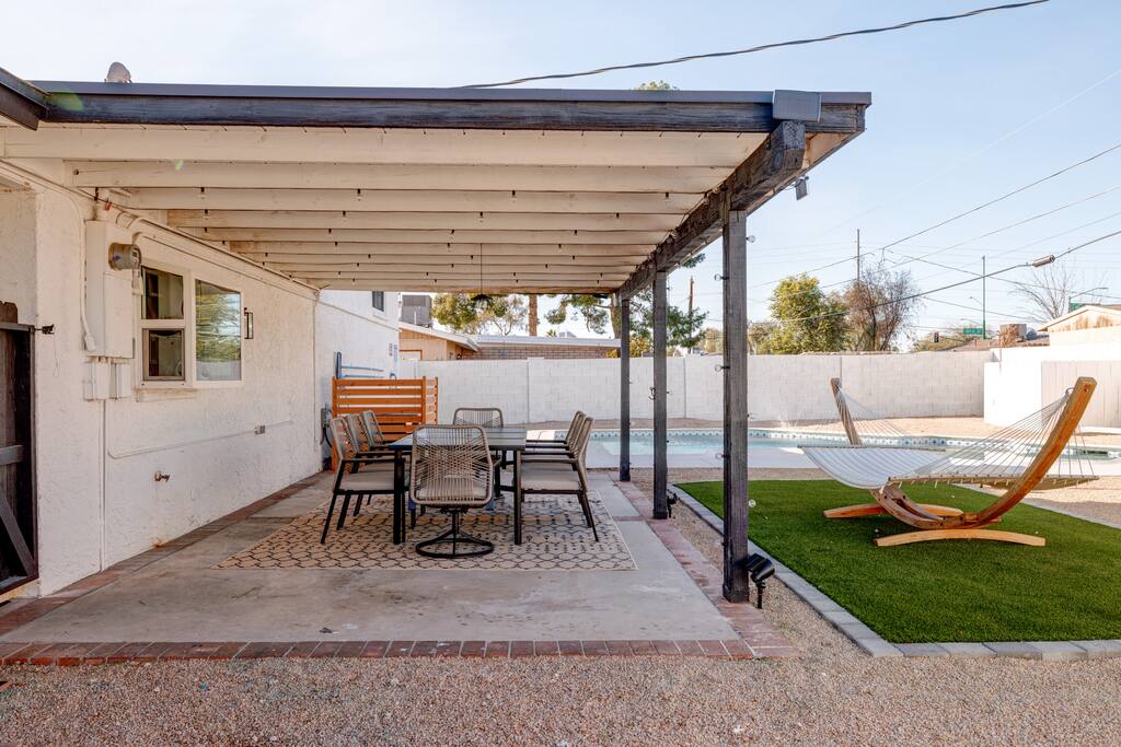 OPEN-CONCEPT LIVING Step into a bright and inviting main level where the living room, dining area, and kitchen flow together seamlessly. Enjoy a large smart TV, comfortable seating, and a convenient half bathroom. This open layout is perfect for groups who want to relax, cook, and gather in one shared space. PRIMARY SUITE The private master suite sits on its own lower level and offers a king bed, en-suite bathroom, smart TV, laundry, and a cozy sitting area with a couch. It’s an ideal retreat for guests who want extra privacy and comfort. UPPER-LEVEL BEDROOMS The top floor includes three additional bedrooms, each designed for rest and comfort. Two bedrooms feature king beds and smart TVs, while the third offers a queen bed with a smart TV. A full bathroom on this level serves all three rooms. BACKYARD OASIS The backyard is wide open and designed for outdoor living. Enjoy a private pool, outdoor dining table, BBQ grill, hammock, and fireplace. It’s the perfect setting for sunny pool days and relaxed evenings outdoors. THE VIBE This three-level home delivers a clean, modern Phoenix experience with generous space for groups to spread out and reconnect. With multiple living zones and a bright indoor-outdoor flow, the home is ideal for weekend getaways, extended stays, and everything in between.