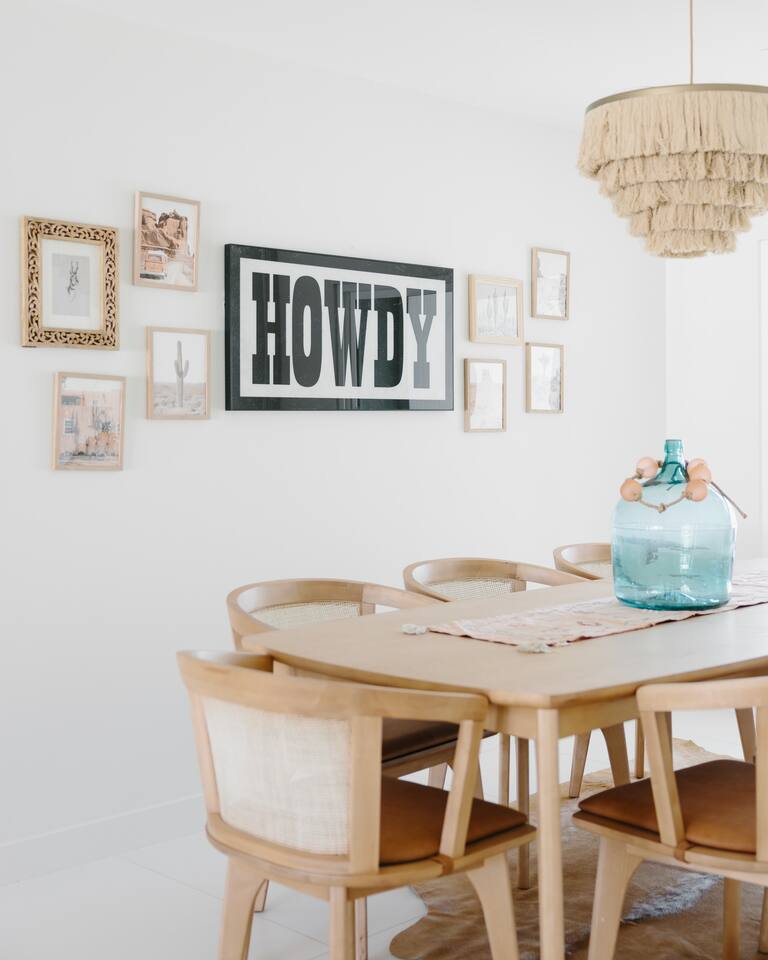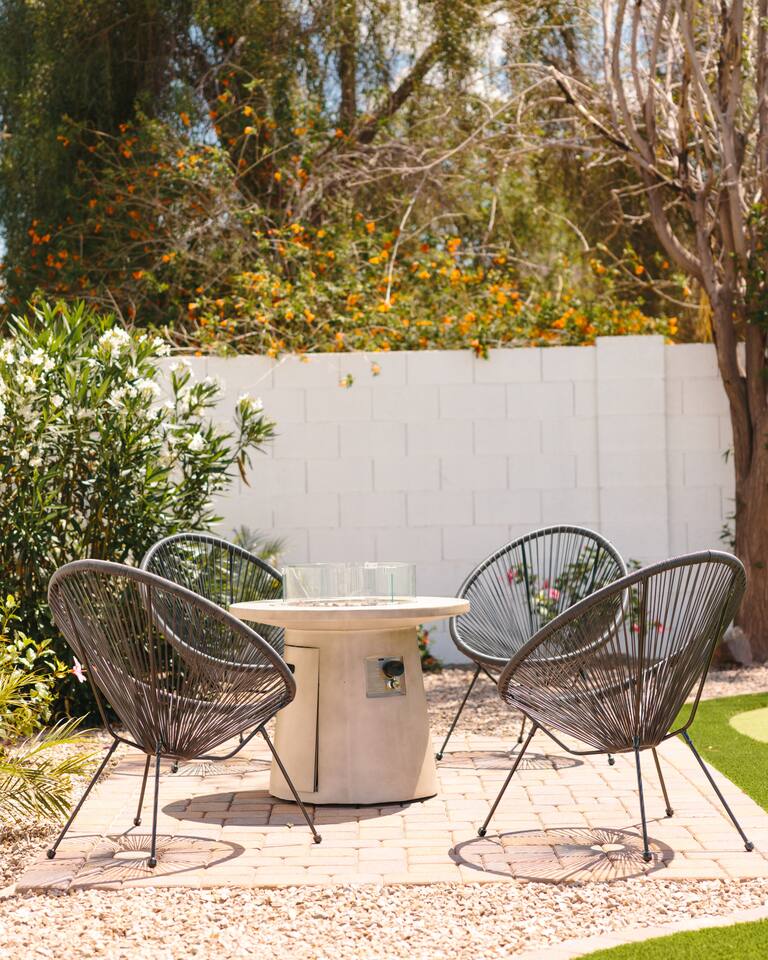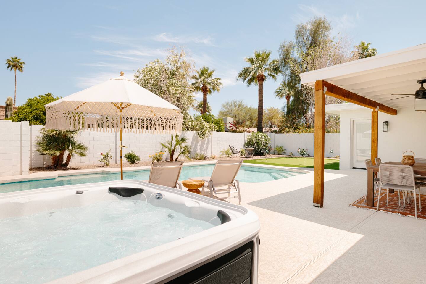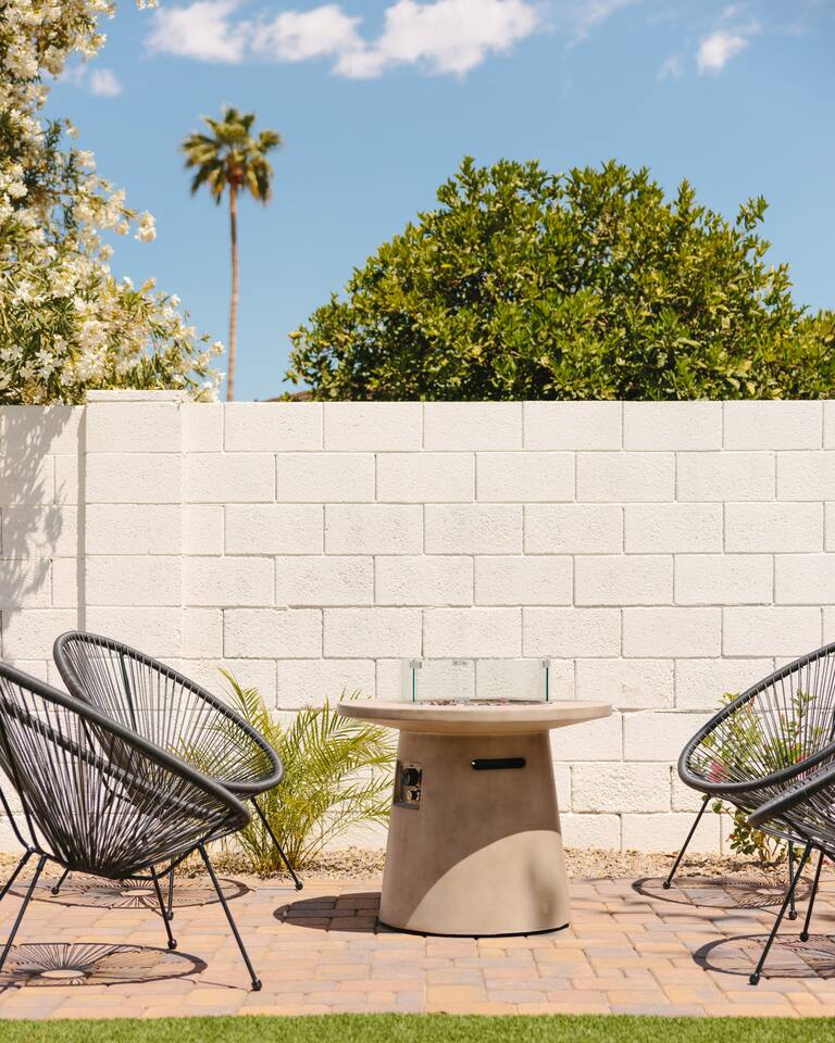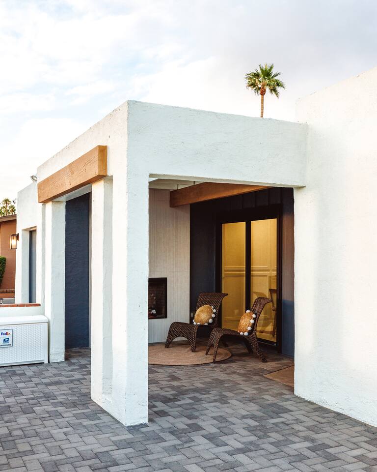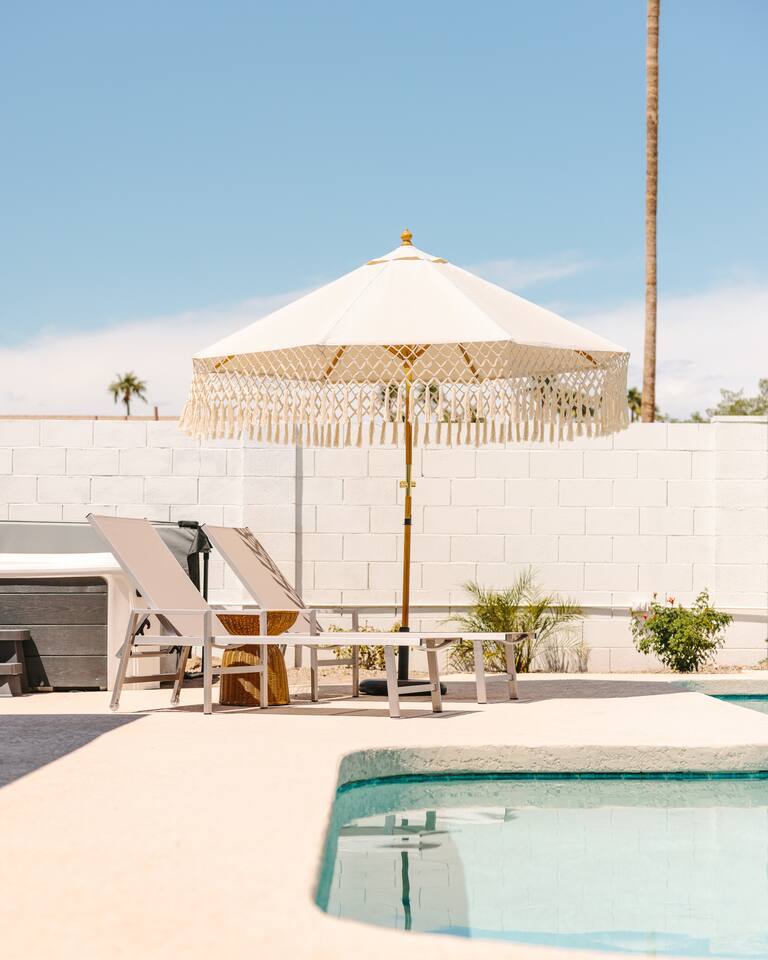 PARKING & ARRIVAL As you arrive, you'll immediately notice the ease of access and ample space provided by the wraparound parking and extended driveway. With room for up to 4–5 vehicles, this property welcomes your group with convenience from the very start. ENTRY & INTERIOR LAYOUT Step through the front door into a bright, airy, and thoughtfully designed open-concept living space. Natural light floods the interiors, highlighting a perfect blend of warm desert tones and chic boho accents. Every room is styled for comfort and luxury. Enjoy KITCHEN At the heart of the home lies a stunning new oak kitchen outfitted with top-of-the-line appliances and all the essentials you need for cooking and entertaining. Stainless steel appliances, ample counter space, and custom cabinetry make this kitchen both functional and elegant. Whether you’re preparing a gourmet meal or blending margaritas for the group, this space delivers. LIVING ROOM The living area offers a welcoming space to unwind, complete with plush seating and a large smart TV. Gather here for movie nights, game days, or simply to relax after a day exploring Scottsdale. The open layout encourages connection, while the refined design offers tranquility. A standout feature of this space is the expansive folding glass patio door, which opens wide to seamlessly blend the indoors with the backyard—perfect for enjoying Arizona’s beautiful weather and effortless indoor-outdoor living. GARAGE GAME SPACE Just off the main living area, the garage has been transformed into a fun rec space featuring a private ping-pong table and a lounge area. Whether it’s friendly competition or laid-back entertainment, it’s a favorite spot for guests of all ages. BEDROOMS & BATHROOMS Each bedroom is styled for maximum comfort, featuring luxurious linens, stylish decor, and ample storage. The bathrooms are equally refined, offering a spa-like feel with modern fixtures and premium finishes. BACKYARD OASIS Step outside and experience your own private resort. The backyard is framed by mountain views and swaying palm trees, creating the ultimate vacation vibe. Lounge by the sparkling pool, soak in the private hot tub (seating five), or enjoy the putting green for a casual round of fun. Cozy up around the fire pit with seating for four, or gather at the outdoor dining table for al fresco meals under the stars. The outdoor BBQ grill makes entertaining easy and memorable. DESIGN & STYLE The entire home is designed in a modern Southwest Boho aesthetic—earthy, stylish, and comfortable. Every element has been curated to elevate your experience, from furniture to finishes. LOCATION SOTO is ideally situated just a short drive from Old Town Scottsdale’s vibrant scene—packed with restaurants, shopping, art, and nightlife. Whether you're here to explore or escape, SOTO puts you in the perfect spot. COFFEE MACHINE INFO We have a DRIP and SINGLE SERVE machine in the unit. We provide a handful of single-serve K cups for each reservation to get you started. Heavy coffee drinkers may need to bring additional coffee. POOL TOWELS We have pool towels at the property for your whole reservation.