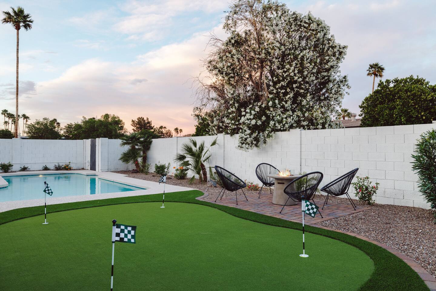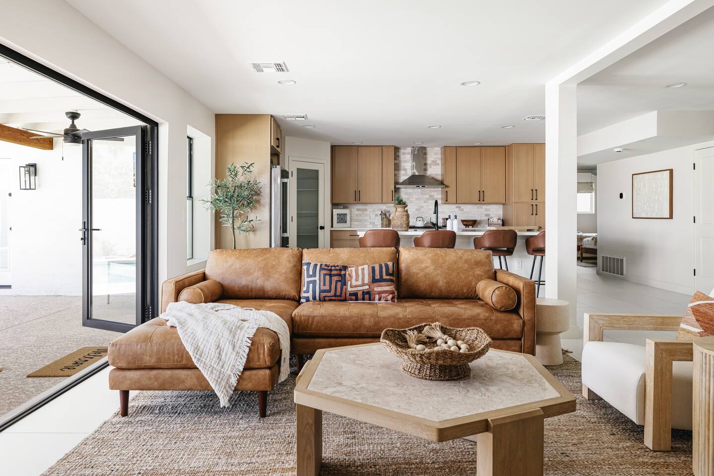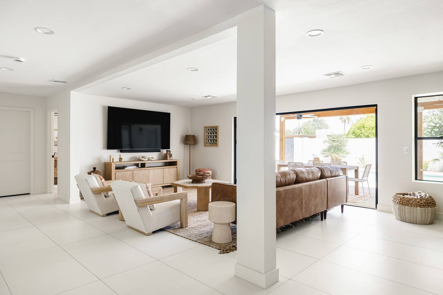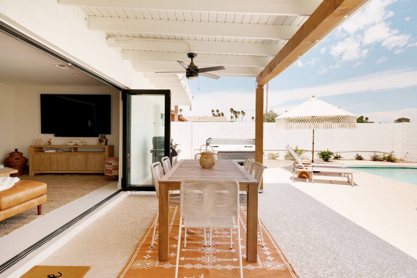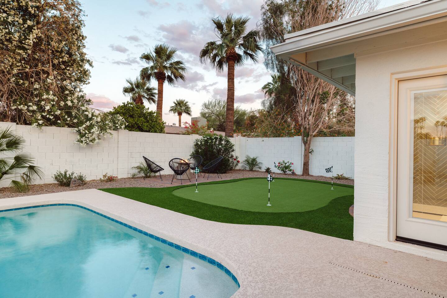 PARKING & ARRIVAL As you arrive, you'll immediately notice the ease of access and ample space provided by the wraparound parking and extended driveway. With room for up to 4–5 vehicles, this property welcomes your group with convenience from the very start. ENTRY & INTERIOR LAYOUT Step through the front door into a bright, airy, and thoughtfully designed open-concept living space. Natural light floods the interiors, highlighting a perfect blend of warm desert tones and chic boho accents. Every room is styled for comfort and luxury. Enjoy KITCHEN At the heart of the home lies a stunning new oak kitchen outfitted with top-of-the-line appliances and all the essentials you need for cooking and entertaining. Stainless steel appliances, ample counter space, and custom cabinetry make this kitchen both functional and elegant. Whether you’re preparing a gourmet meal or blending margaritas for the group, this space delivers. LIVING ROOM The living area offers a welcoming space to unwind, complete with plush seating and a large smart TV. Gather here for movie nights, game days, or simply to relax after a day exploring Scottsdale. The open layout encourages connection, while the refined design offers tranquility. A standout feature of this space is the expansive folding glass patio door, which opens wide to seamlessly blend the indoors with the backyard—perfect for enjoying Arizona’s beautiful weather and effortless indoor-outdoor living. GARAGE GAME SPACE Just off the main living area, the garage has been transformed into a fun rec space featuring a private ping-pong table and a lounge area. Whether it’s friendly competition or laid-back entertainment, it’s a favorite spot for guests of all ages. BEDROOMS & BATHROOMS Each bedroom is styled for maximum comfort, featuring luxurious linens, stylish decor, and ample storage. The bathrooms are equally refined, offering a spa-like feel with modern fixtures and premium finishes. BACKYARD OASIS Step outside and experience your own private resort. The backyard is framed by mountain views and swaying palm trees, creating the ultimate vacation vibe. Lounge by the sparkling pool, soak in the private hot tub (seating five), or enjoy the putting green for a casual round of fun. Cozy up around the fire pit with seating for four, or gather at the outdoor dining table for al fresco meals under the stars. The outdoor BBQ grill makes entertaining easy and memorable. DESIGN & STYLE The entire home is designed in a modern Southwest Boho aesthetic—earthy, stylish, and comfortable. Every element has been curated to elevate your experience, from furniture to finishes. LOCATION SOTO is ideally situated just a short drive from Old Town Scottsdale’s vibrant scene—packed with restaurants, shopping, art, and nightlife. Whether you're here to explore or escape, SOTO puts you in the perfect spot. COFFEE MACHINE INFO We have a DRIP and SINGLE SERVE machine in the unit. We provide a handful of single-serve K cups for each reservation to get you started. Heavy coffee drinkers may need to bring additional coffee. POOL TOWELS We have pool towels at the property for your whole reservation.