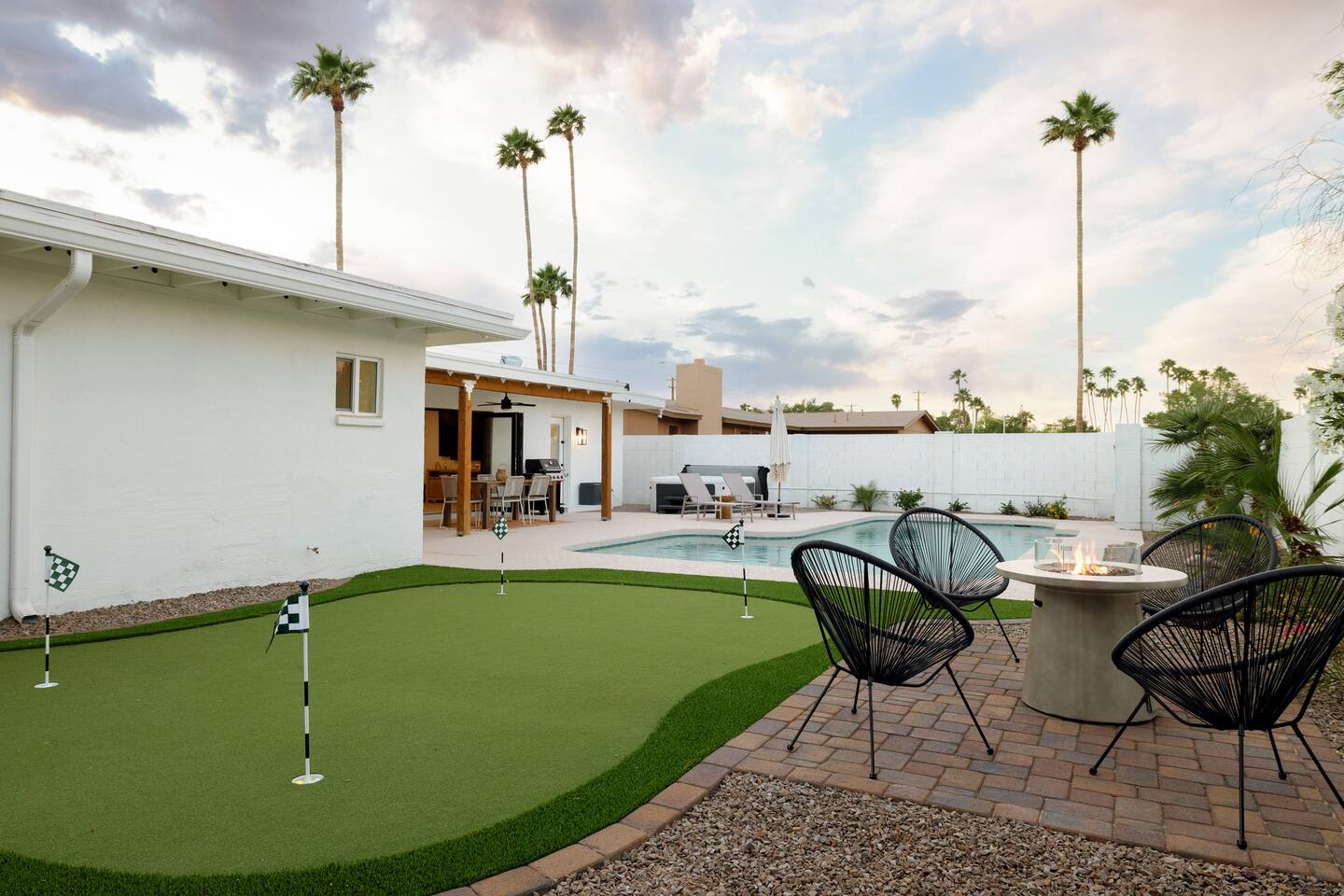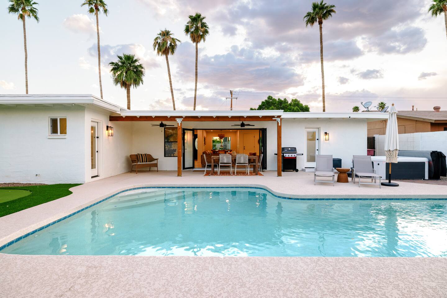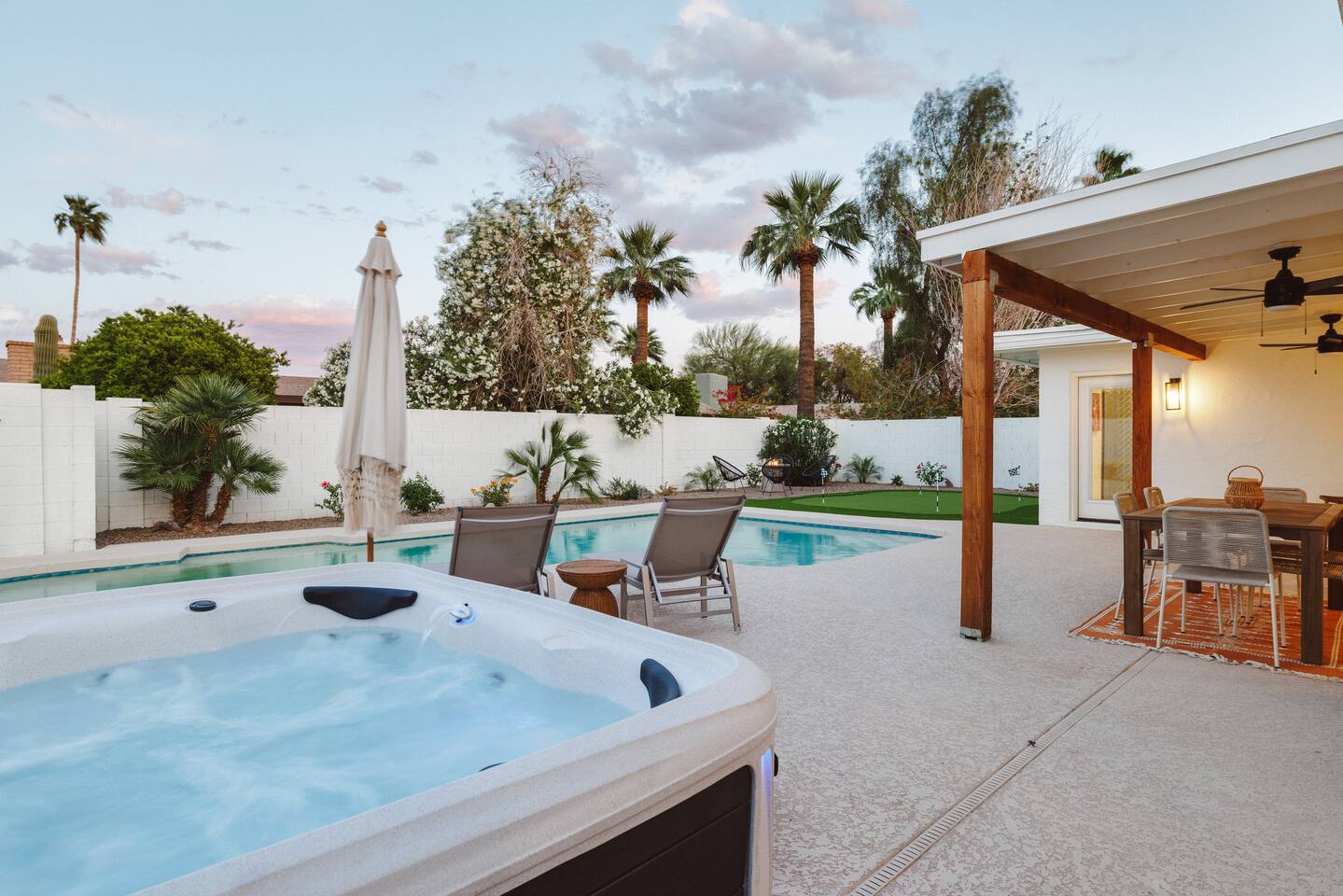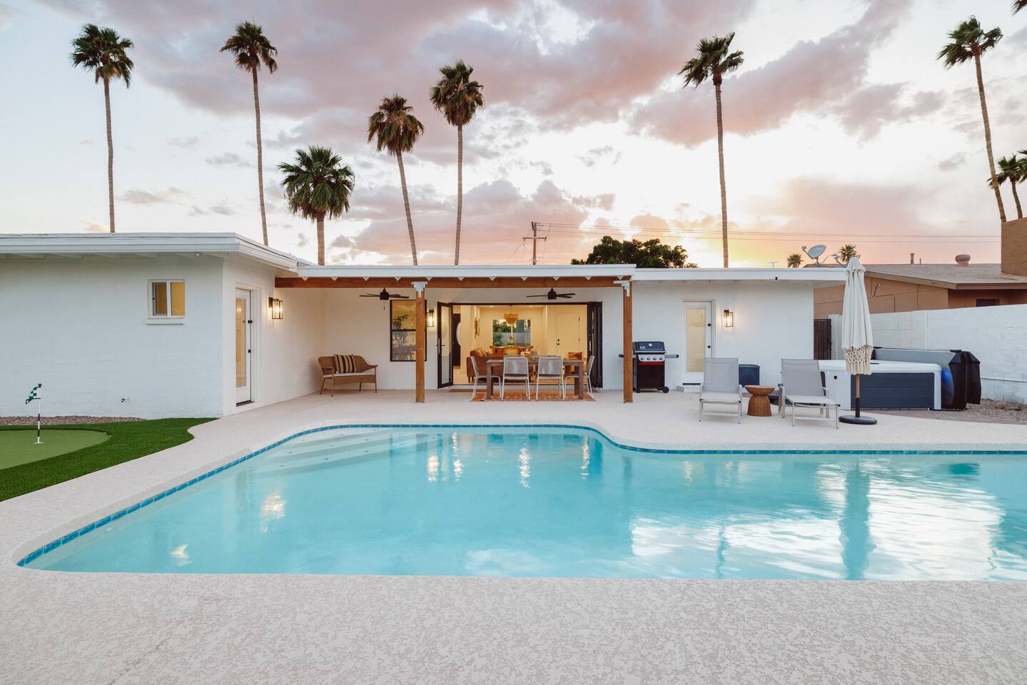 Scottsdale Old Town Oasis (SOTO) is a newly remodeled home only minutes away from Old Town Scottsdale! This open floor plan is the perfect space for young adults or families to enjoy. Complete with a pool, hot tub, fire pit, putting green, outdoor BBQ grill, ping pong table, and outdoor dining with tropical views of palm trees and mountains! This is the ultimate private resort vibe, with picturesque spots around every corner!