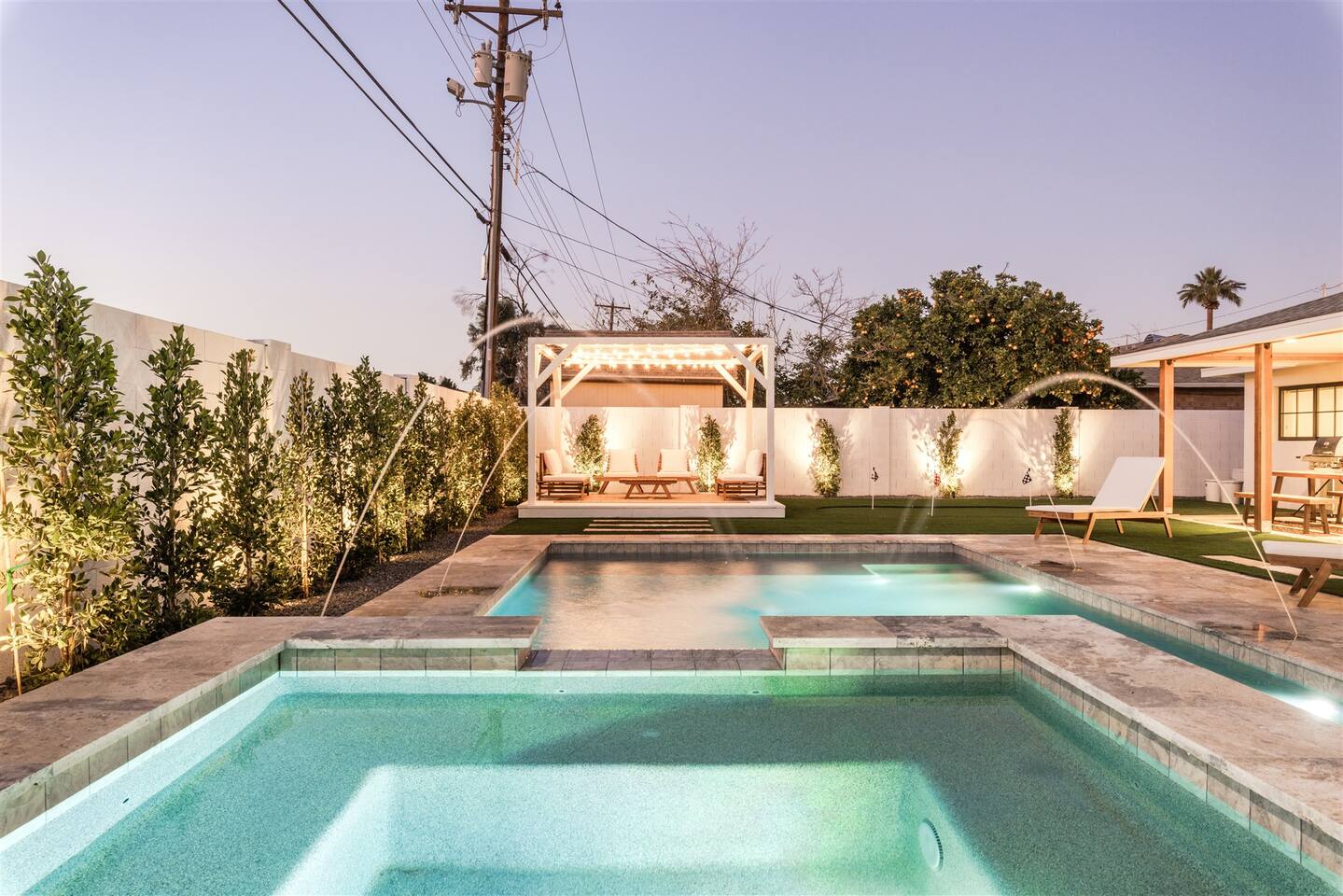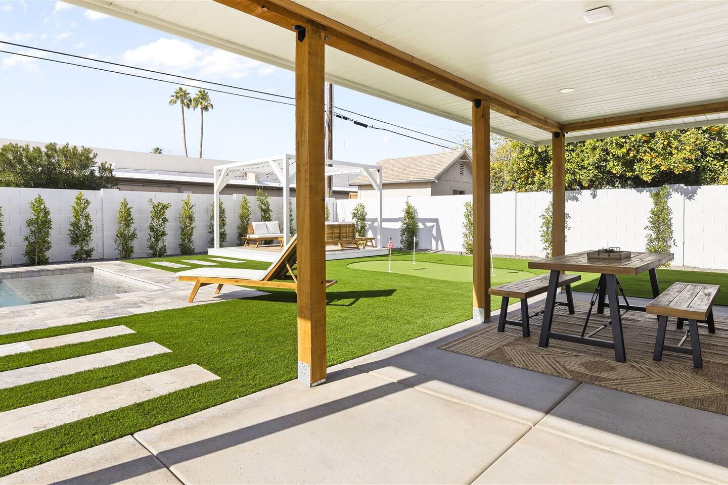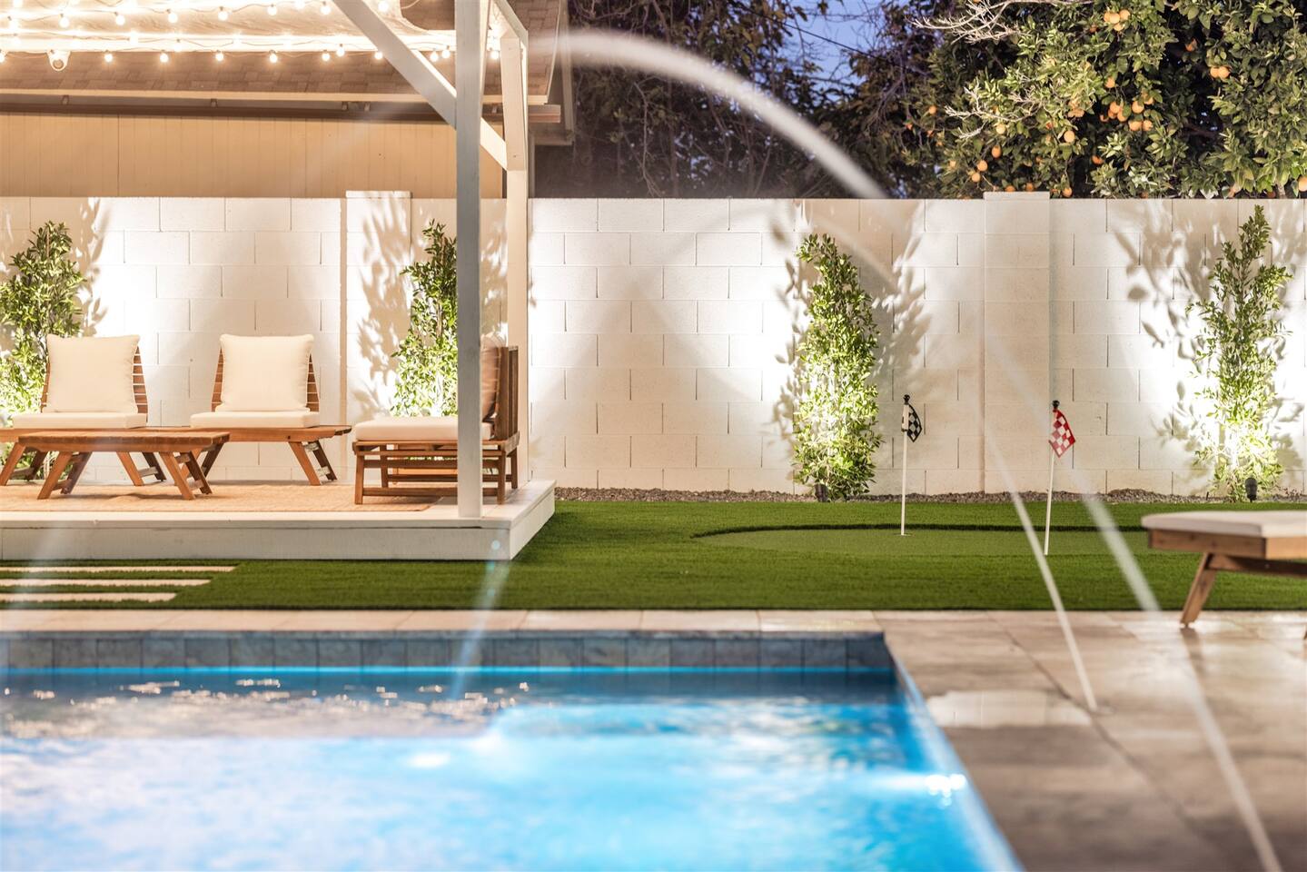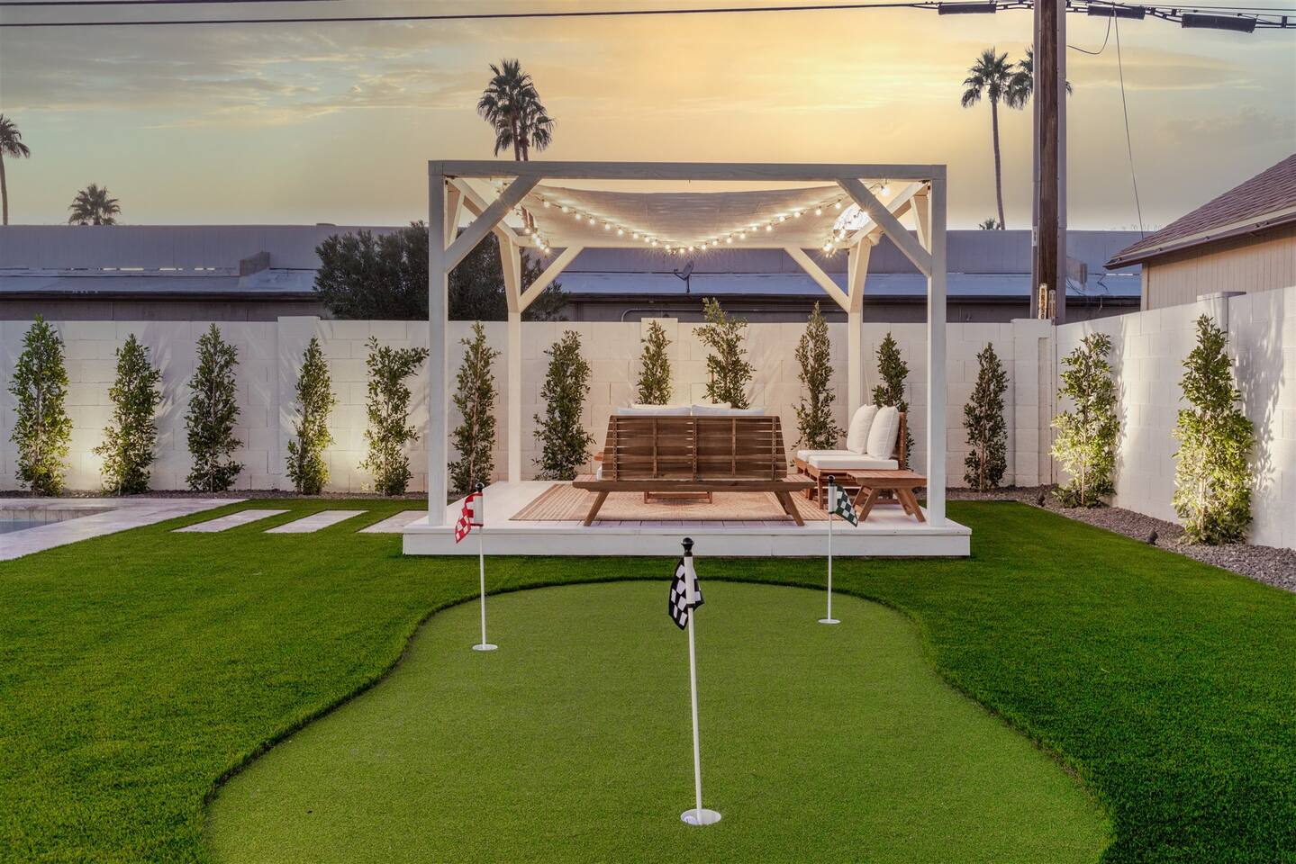 Reesor Desert Resort is a newly remodeled modern desert oasis, only minutes away from Old Town Scottsdale! This open floor plan is the perfect space for young adults or families to enjoy. Complete with a pool, hot tub, fire pit, putting green, outdoor bbq grill, and outdoor dining with tropical views of palm trees and mountains! This is the ultimate private resort vibe, with picturesque spots around every corner!