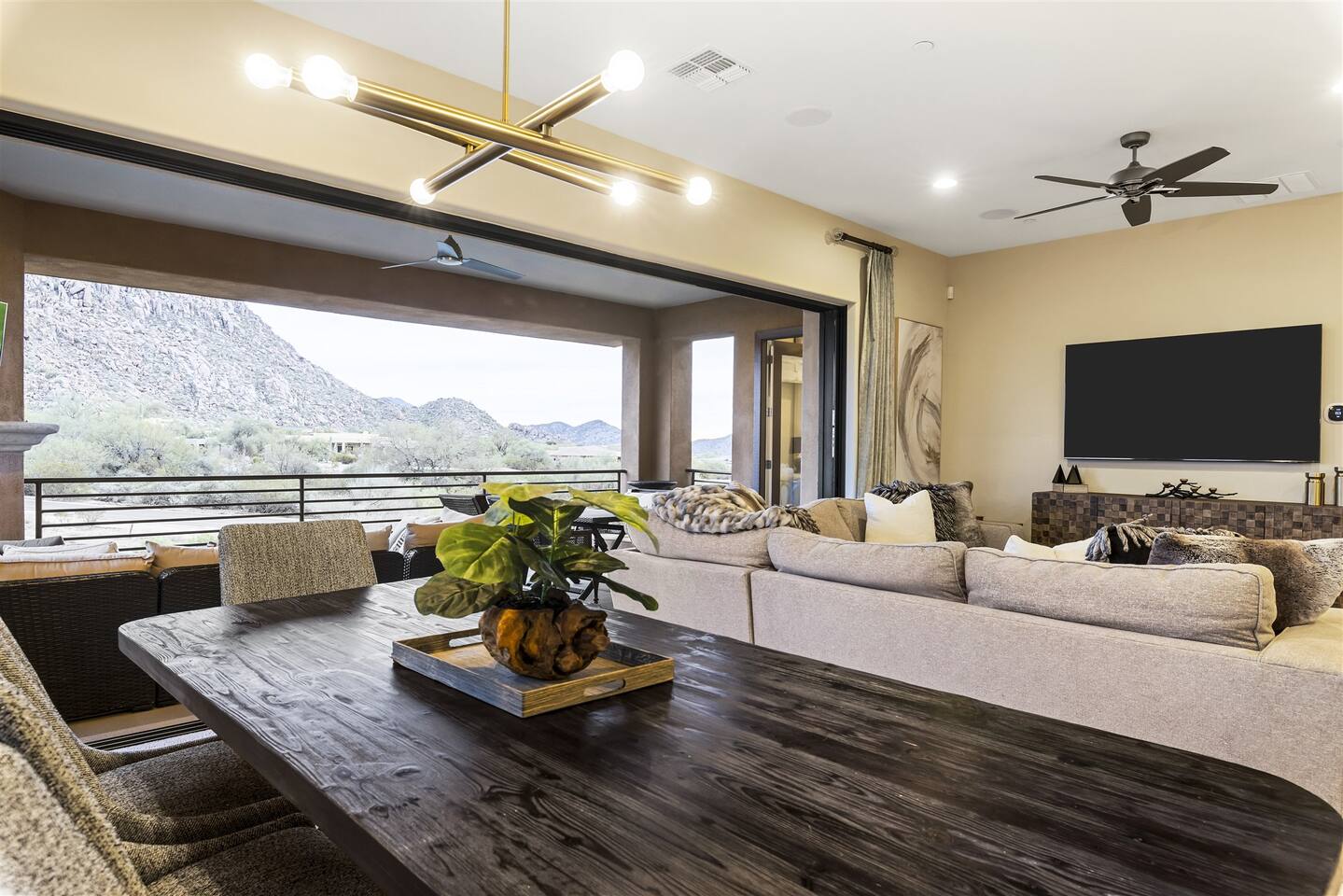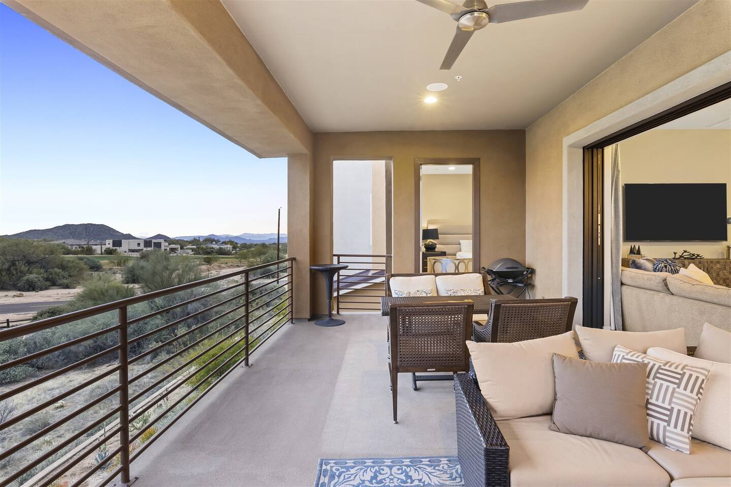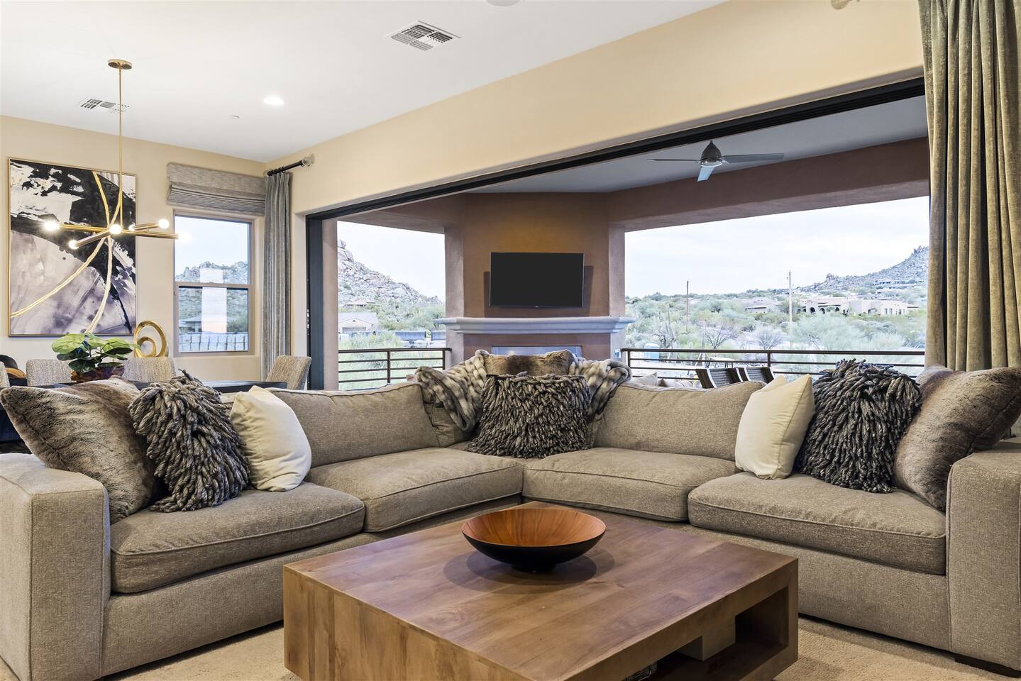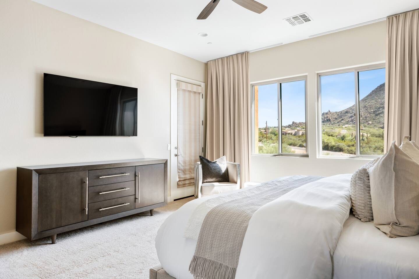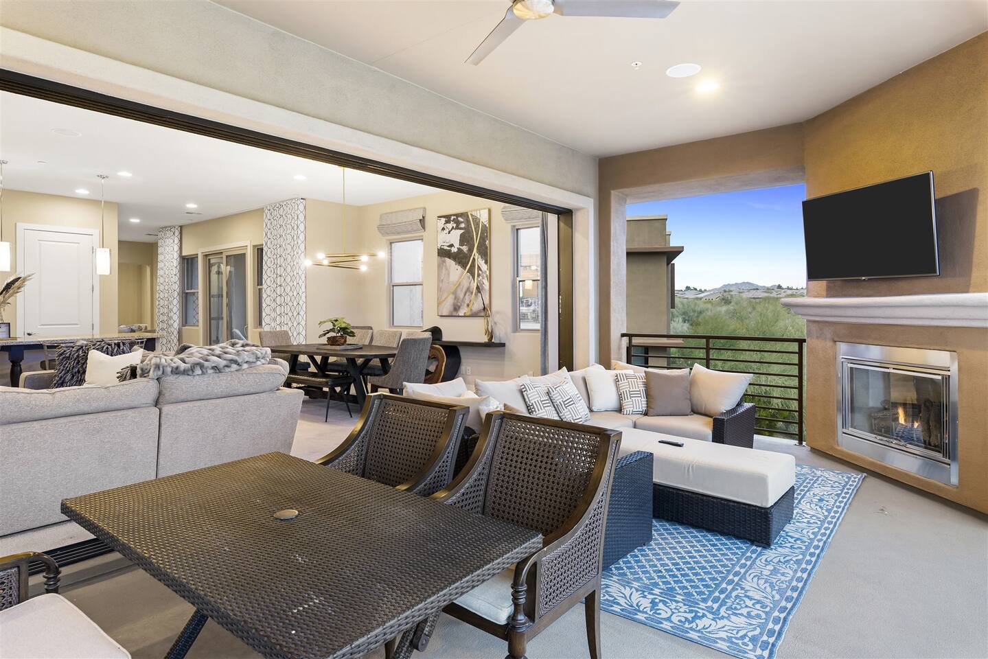 ARRIVAL & ENTRY Enter through your private, attached garage into a welcoming foyer—parking and unloading are seamless. A single flight of stairs leads to the entire residence on one level. MAIN LIVING AREA An open-concept great room pairs designer furnishings with a dramatic wall-length sliding glass door that opens fully to the patio for true indoor–outdoor living and uninterrupted mountain views. CHEF’S KITCHEN & DINING Sleek, fully equipped kitchen with premium appliances and generous island seating flows to a sophisticated dining area—ideal for casual breakfasts or elegant dinners. SIGNATURE PATIO Your private outdoor lounge is an entertainer’s dream: - TV for game nights and movies under the stars - Built-in grill for al-fresco dining - Fireplace for golden-hour cocktails and cool desert evenings - Expansive seating oriented to the McDowell Mountain backdrop BEDROOMS & BATHS - PRIMARY SUITE – King bed, spa bath with large walk-in shower and soaking tub - SECOND BEDROOM – Queen bed with en-suite bathroom - THIRD BEDROOM – Queen bed with adjacent full bath - ADDITIONAL SLEEPING – Queen sleeper sofa on landing - LAUNDRY – In-home washer & dryer for longer stays COMMUNITY AMENITIES - Heated pool and spa - Outdoor BBQ areas - Fitness room (community) - Pristine Sonoran landscaping and walkways LOCATION & LIFESTYLE Minutes to Troon North Golf Club, Pinnacle Peak hiking, and North Scottsdale’s premier dining and shopping. Approximately 12 miles to Mayo Clinic. ACCESSIBILITY NOTE: Not wheelchair accessible; living space is on the second level accessed by one interior staircase.