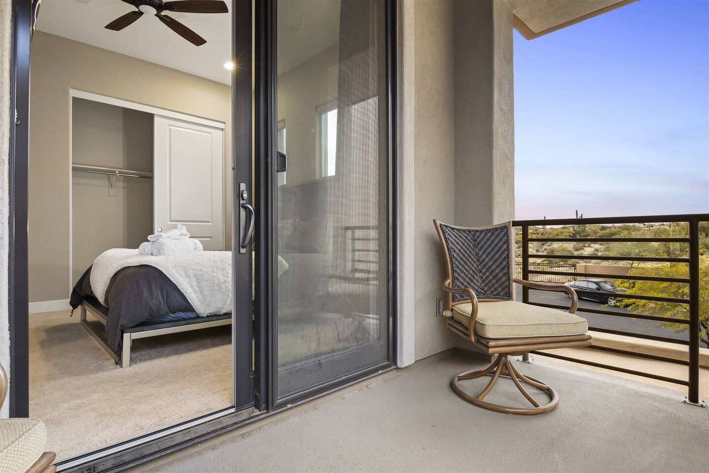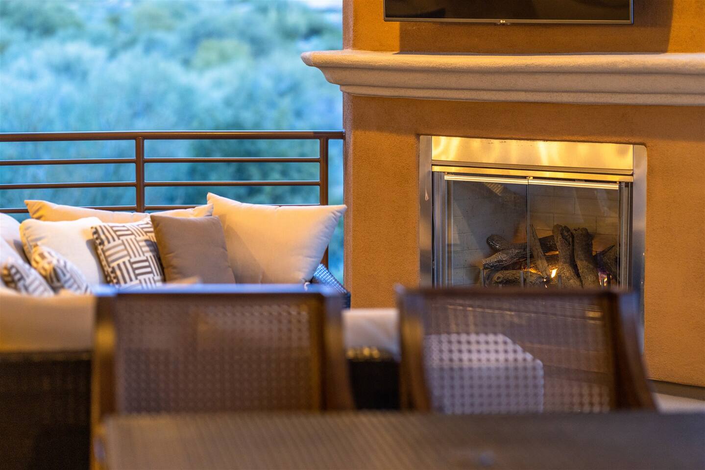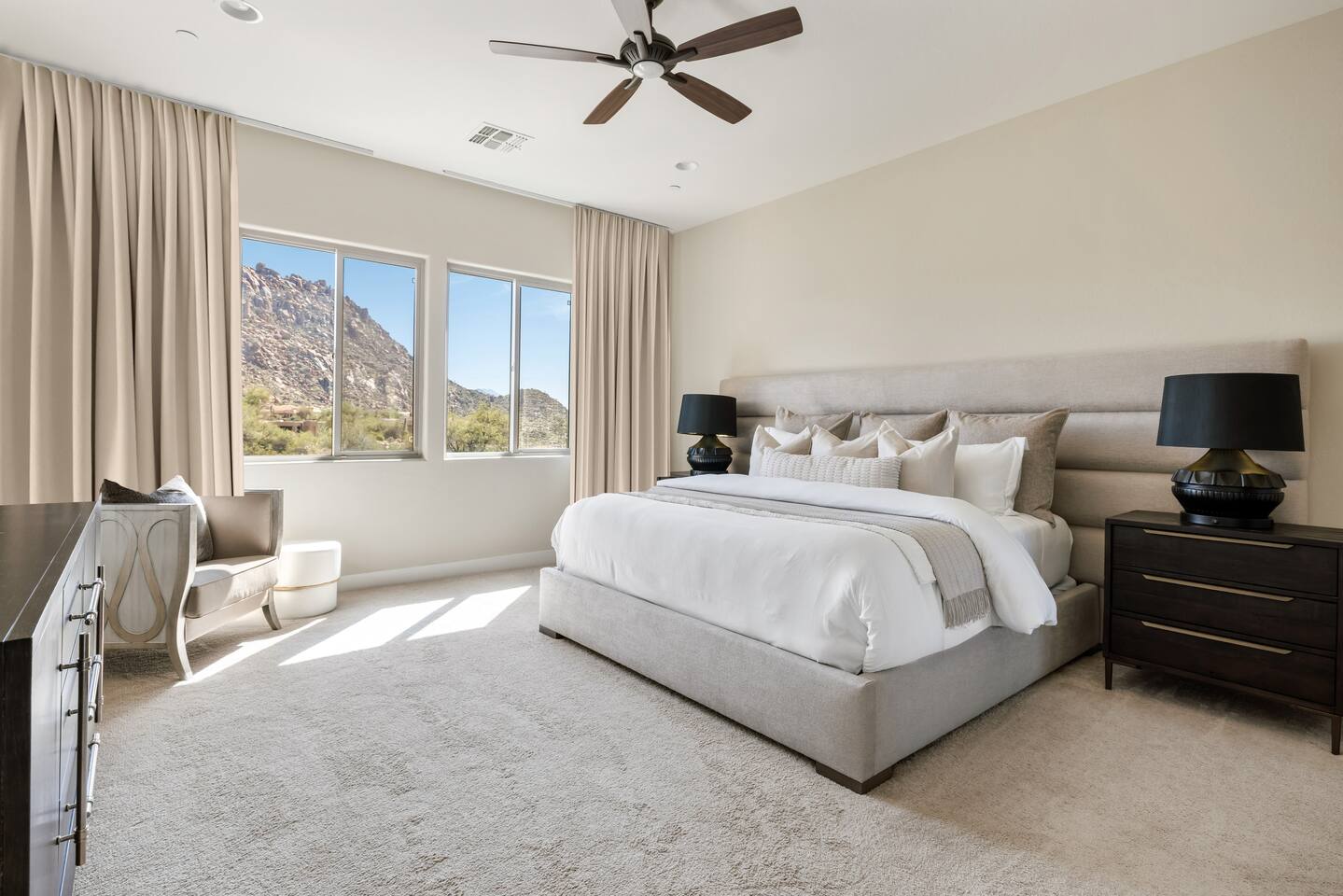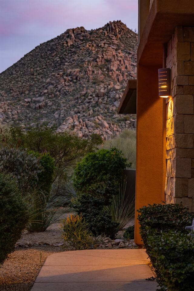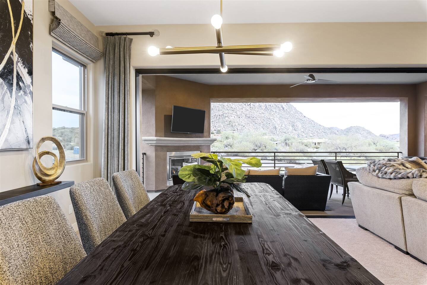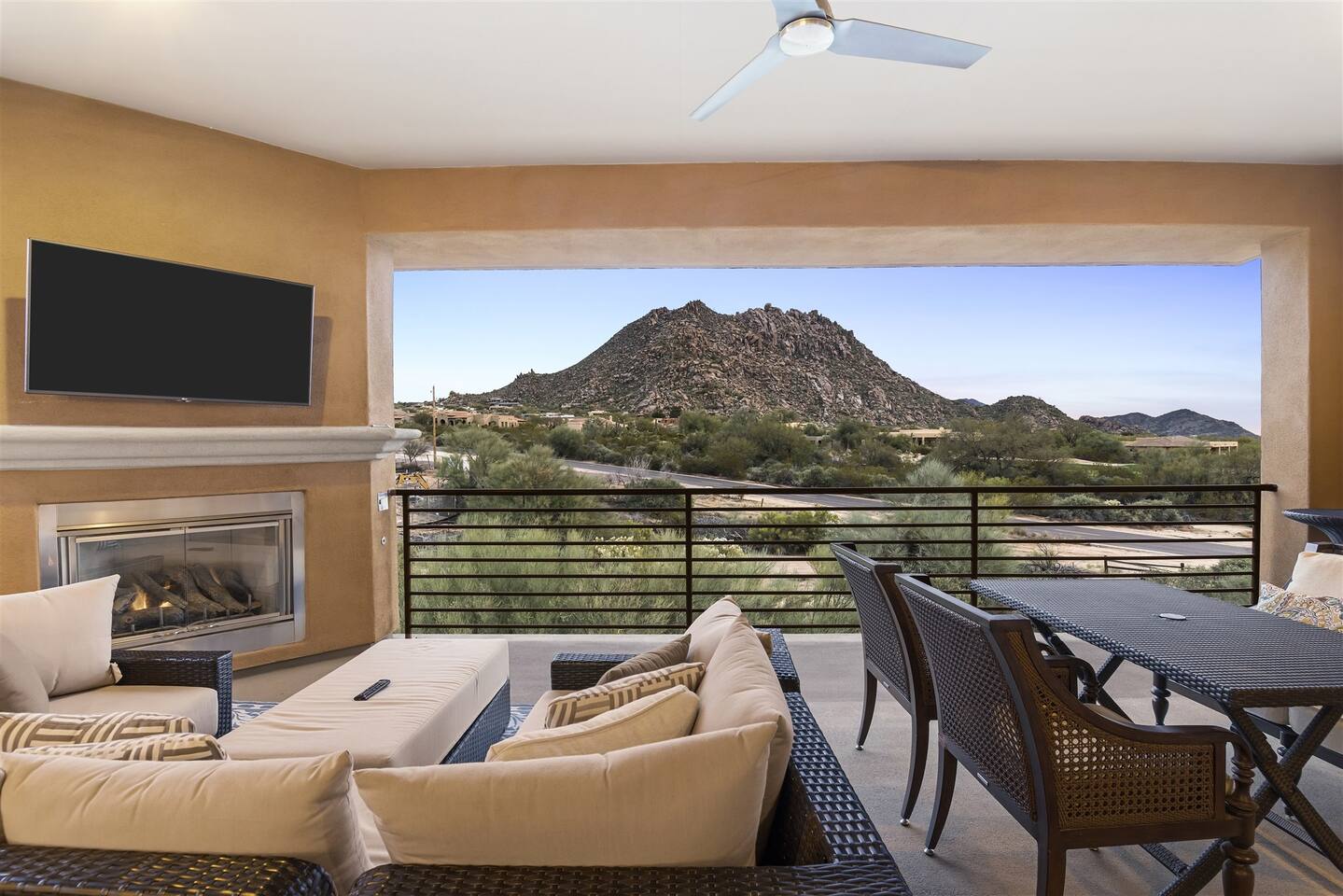 ARRIVAL & ENTRY Enter through your private, attached garage into a welcoming foyer—parking and unloading are seamless. A single flight of stairs leads to the entire residence on one level. MAIN LIVING AREA An open-concept great room pairs designer furnishings with a dramatic wall-length sliding glass door that opens fully to the patio for true indoor–outdoor living and uninterrupted mountain views. CHEF’S KITCHEN & DINING Sleek, fully equipped kitchen with premium appliances and generous island seating flows to a sophisticated dining area—ideal for casual breakfasts or elegant dinners. SIGNATURE PATIO Your private outdoor lounge is an entertainer’s dream: - TV for game nights and movies under the stars - Built-in grill for al-fresco dining - Fireplace for golden-hour cocktails and cool desert evenings - Expansive seating oriented to the McDowell Mountain backdrop BEDROOMS & BATHS - PRIMARY SUITE – King bed, spa bath with large walk-in shower and soaking tub - SECOND BEDROOM – Queen bed with en-suite bathroom - THIRD BEDROOM – Queen bed with adjacent full bath - ADDITIONAL SLEEPING – Queen sleeper sofa on landing - LAUNDRY – In-home washer & dryer for longer stays COMMUNITY AMENITIES - Heated pool and spa - Outdoor BBQ areas - Fitness room (community) - Pristine Sonoran landscaping and walkways LOCATION & LIFESTYLE Minutes to Troon North Golf Club, Pinnacle Peak hiking, and North Scottsdale’s premier dining and shopping. Approximately 12 miles to Mayo Clinic. ACCESSIBILITY NOTE: Not wheelchair accessible; living space is on the second level accessed by one interior staircase.
